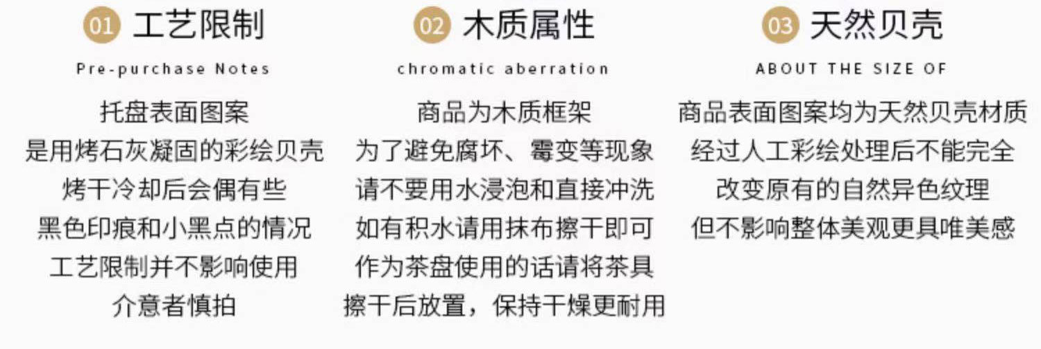 【保养】贝壳盘请不要用水浸泡或直接冲洗,不可长时间放置潮湿处也不能暴晒,沾水后及时晾干。