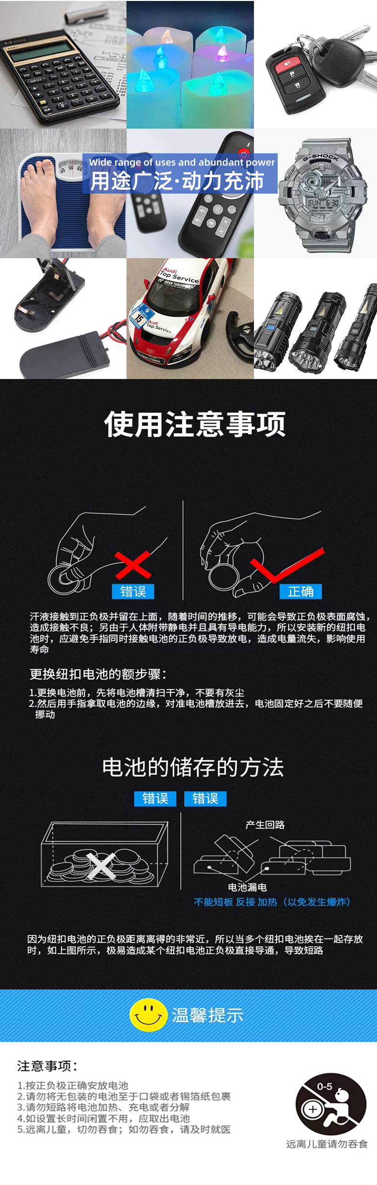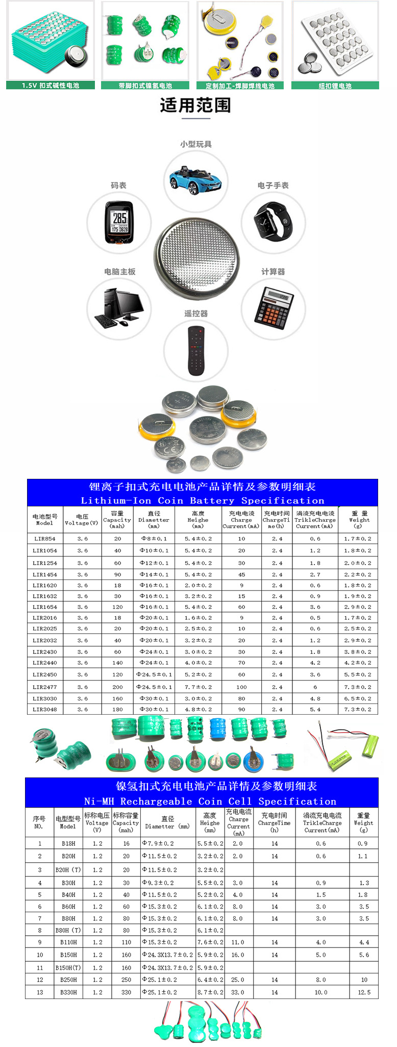 • ML系列:ML系列纽扣电池一般为3V可充电锂锰电池。其适用范围广泛,可用于钟表、鞋灯、电脑主板、电子温度计、电子玩具、蓝牙无线产品、多功能无线遥控器、电子礼品等。工作温度通常为-20℃至60℃,存储温度一般为-10℃至45℃。