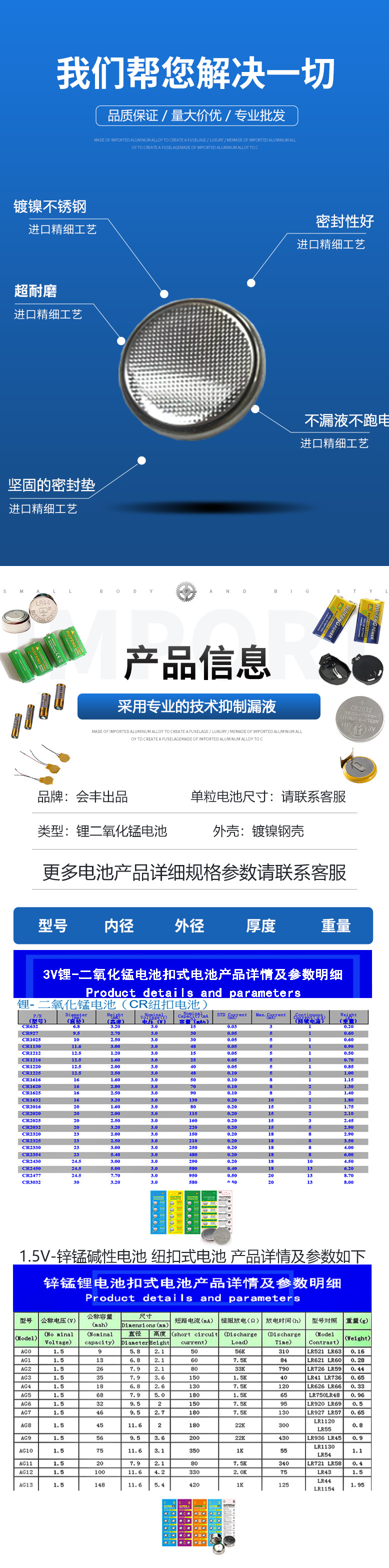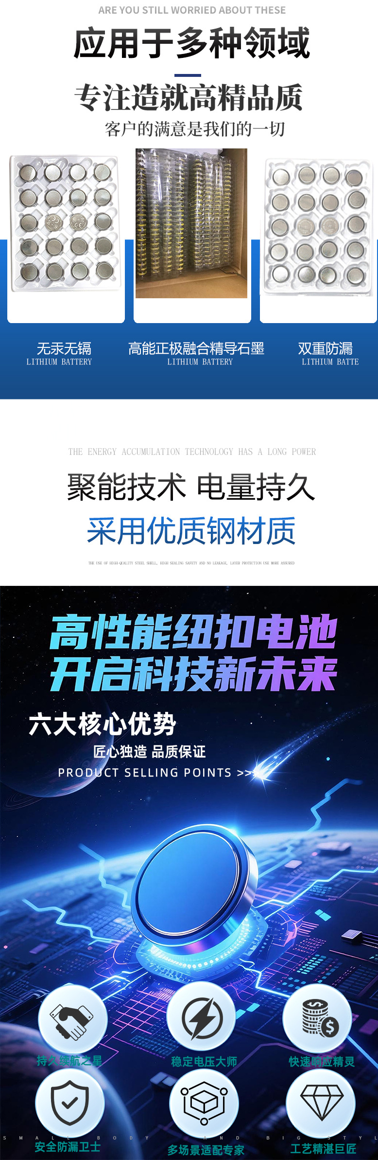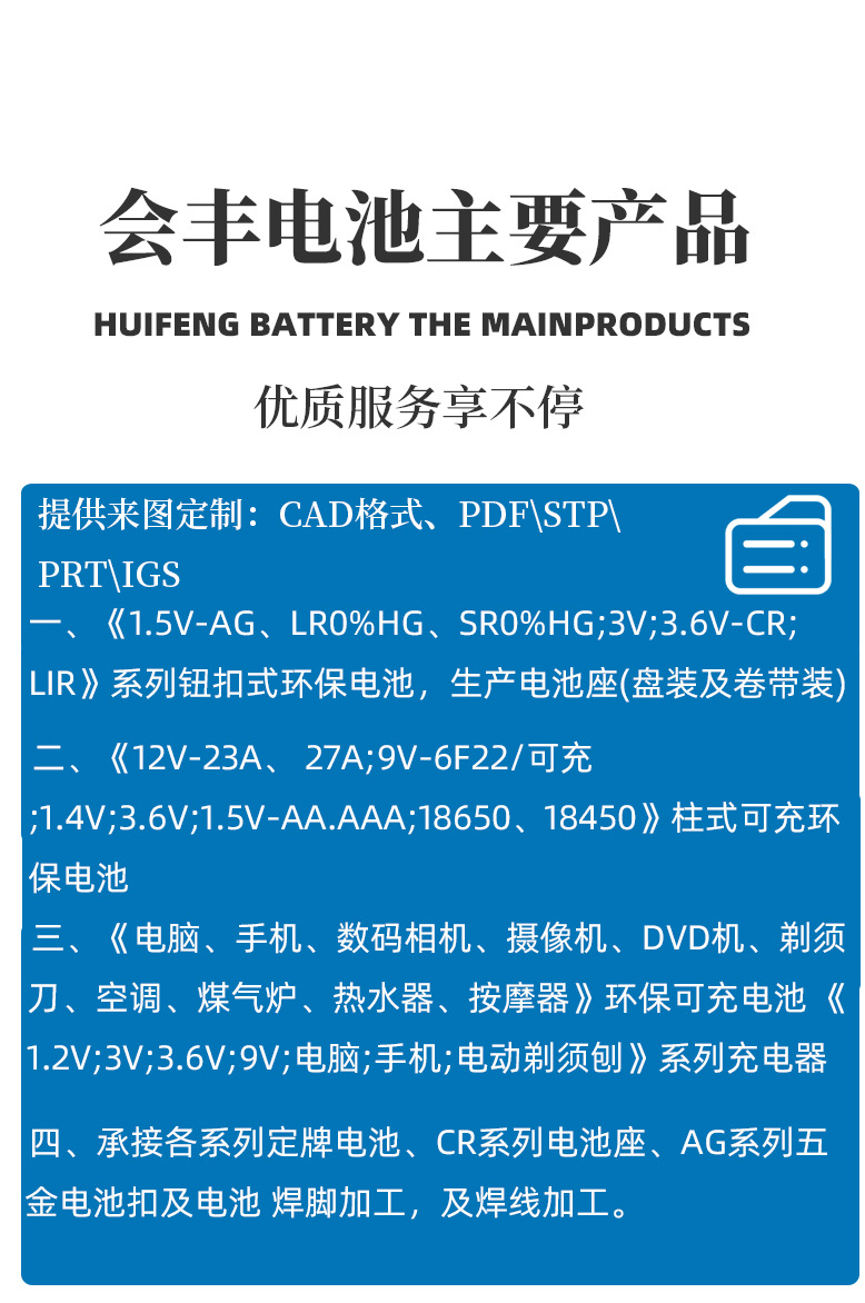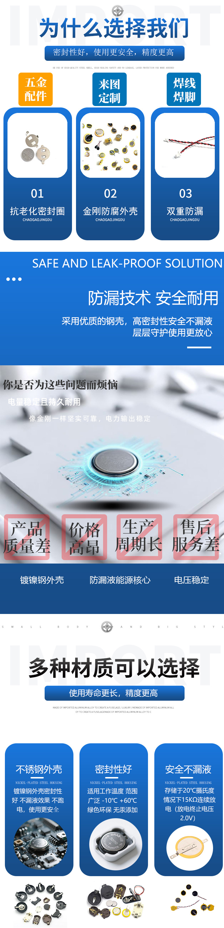 • LIR系列:LIR系列纽扣电池通常为3.6V或3.7V锂离子可充电电池。常用于小功耗的电子产品、安防设备、电子蜡烛、汽车钥匙、电子秤、电子体温计、血糖仪等。该系列电池的工作温度大多在-20℃至60℃之间。存储温度一般没有明确统一的标准,但参考类似锂电池的存储条件,在-10℃至45℃较为合适。...