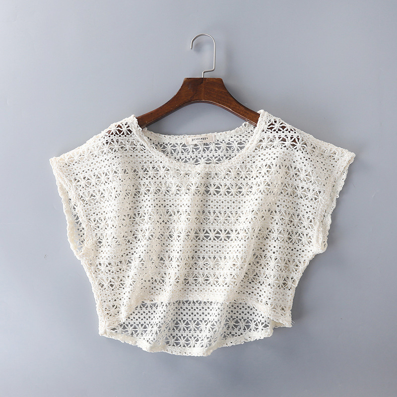 일본식 달콤한 중공 크로 셰 뜨개질 레이스 셔츠 짧은 박쥐 소매 블라우스 느슨한 니트 앞 짧은 등 긴 탑