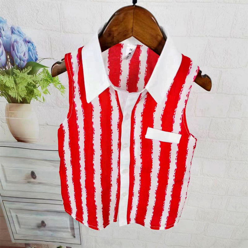 아동용 줄무늬 셔츠 남아 여름 한국 스타일 민소매 셔츠 멋진 여름 얇은 패션 상의 흰색 반바지 세트