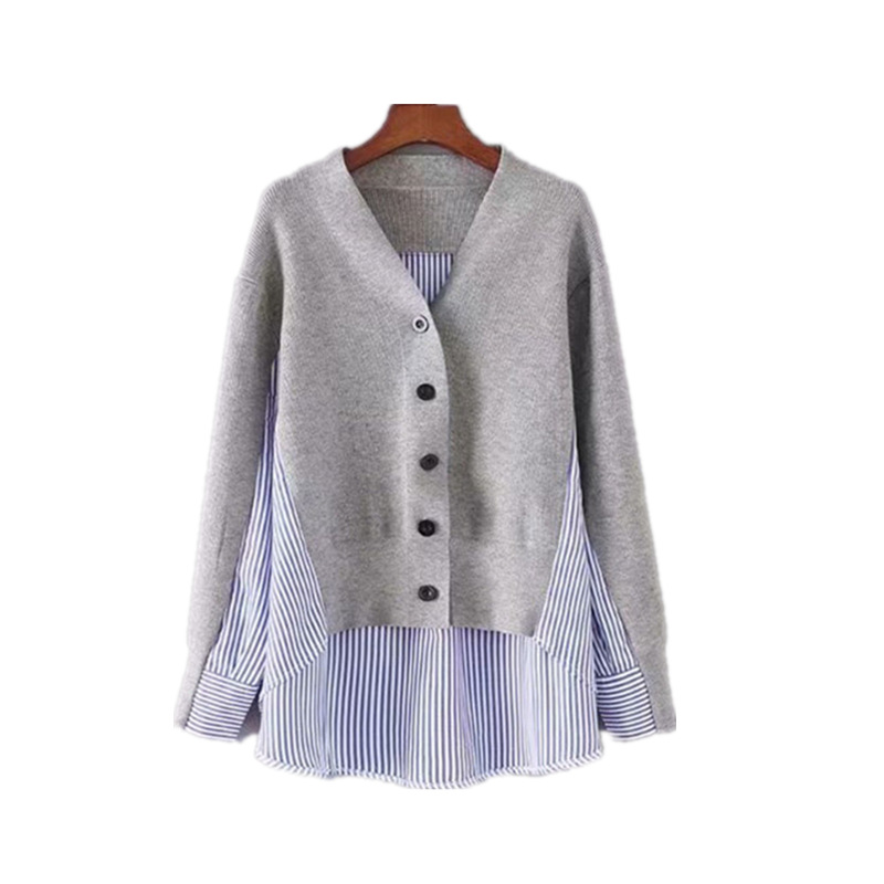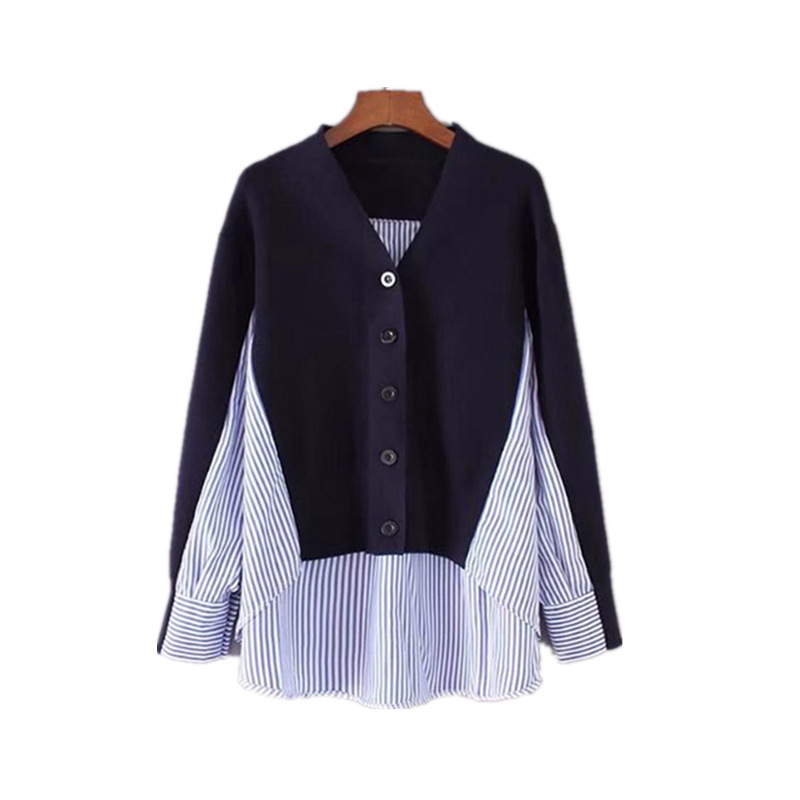 브이넥 루즈핏 스웨터 여성용 한국 스타일 스트라이프 셔츠 스플라이싱 긴팔 니트 가디건 코트 가을 겨울 다용도