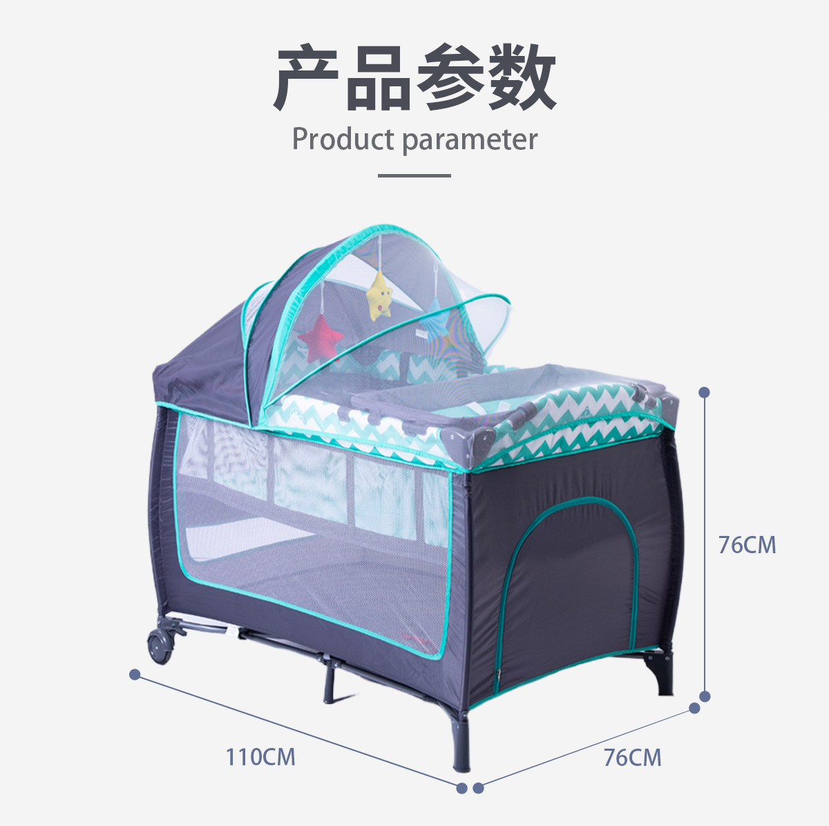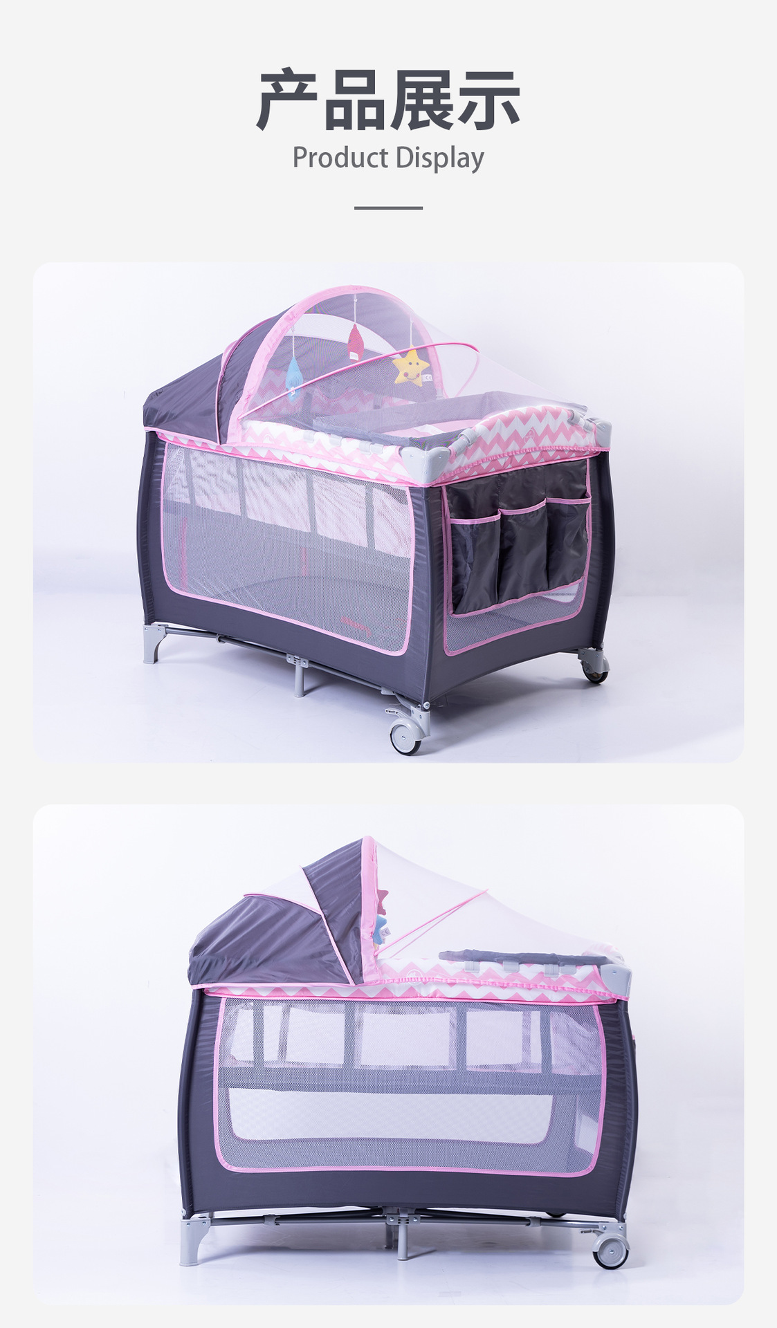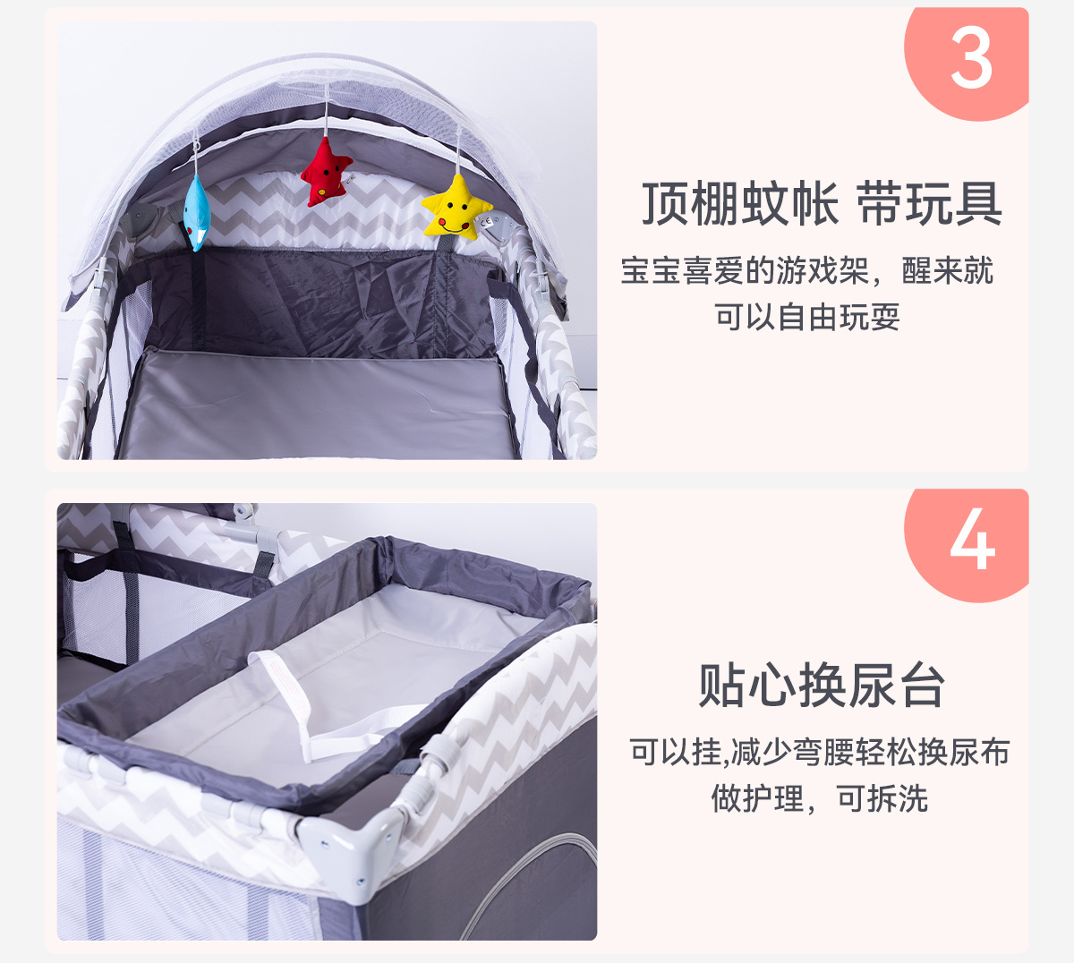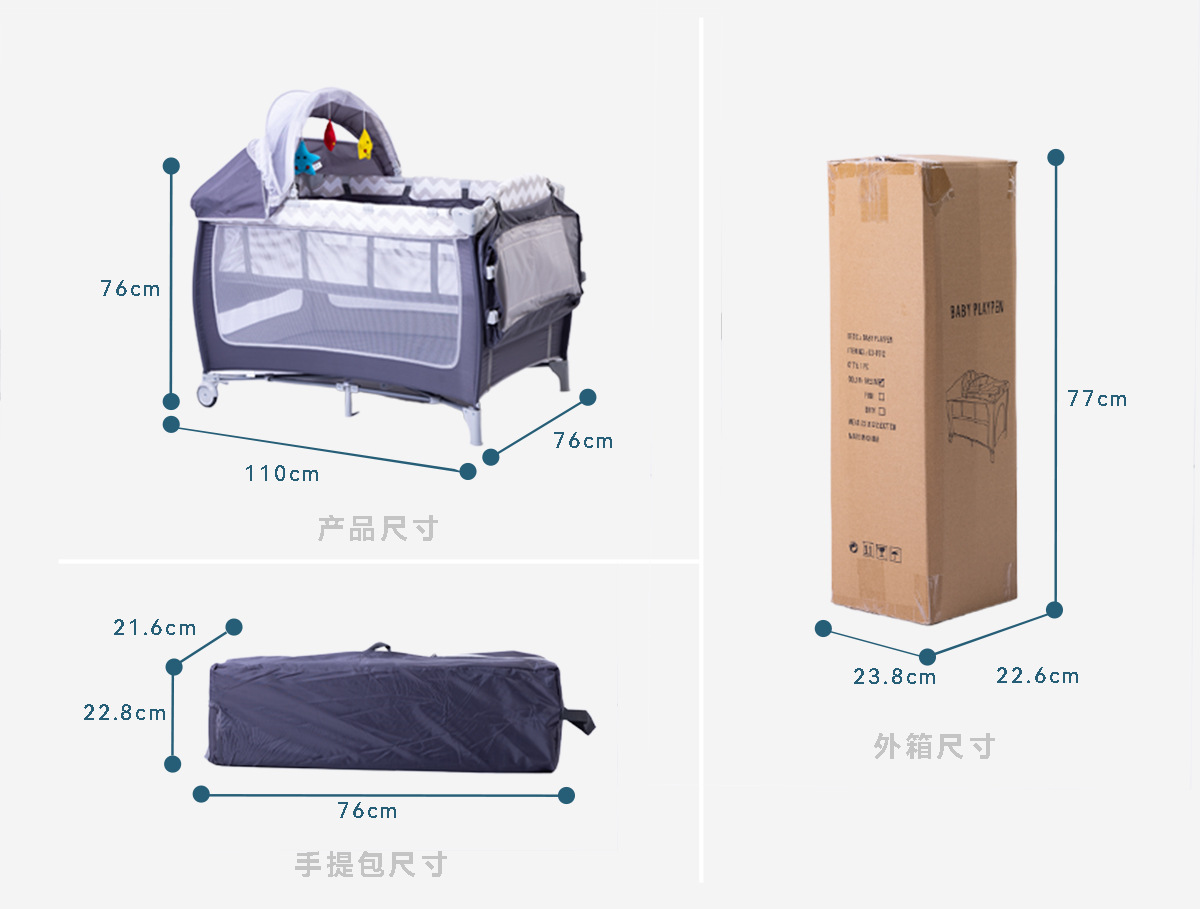 产品功能:可移动、折叠、睡觉、游戏、换洗尿布台