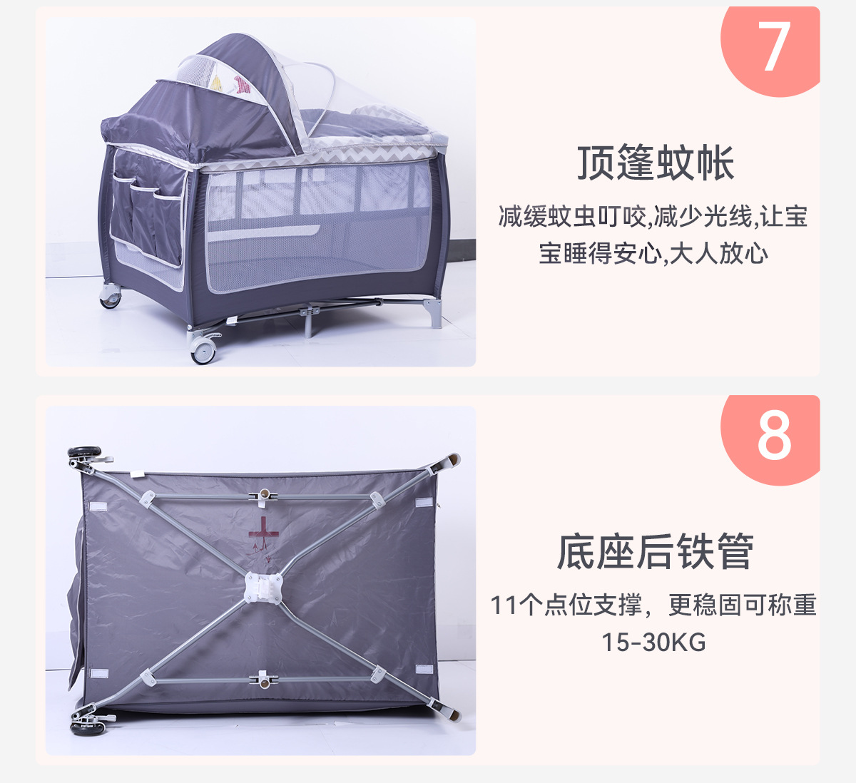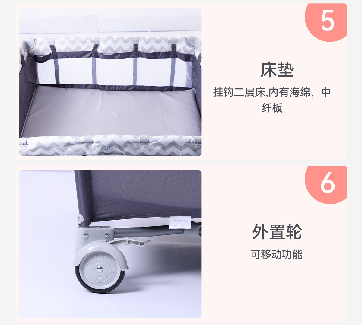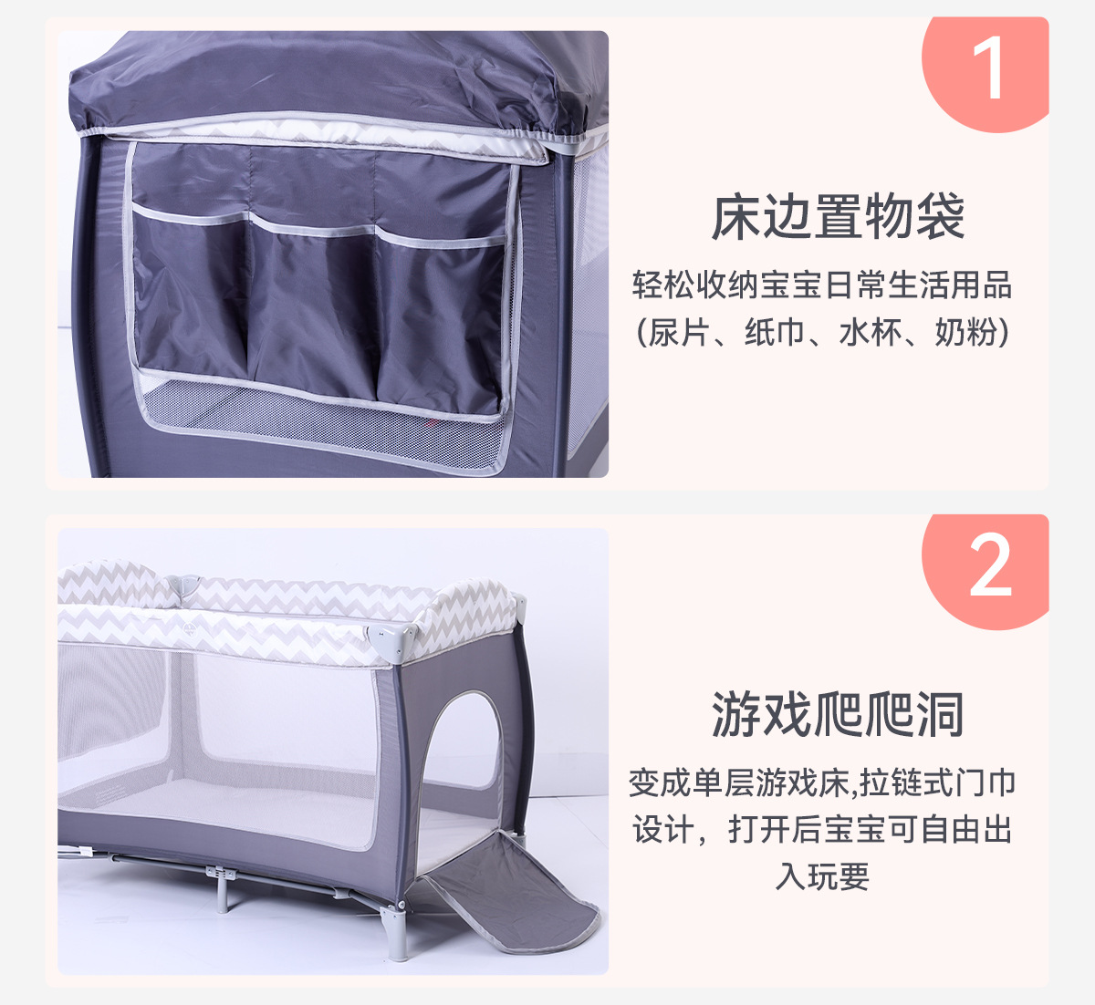 产品功能:可移动、折叠、睡觉、游戏、换洗尿布台
