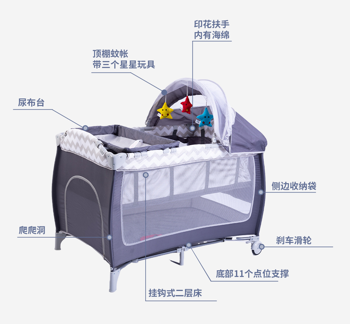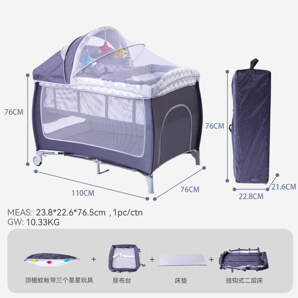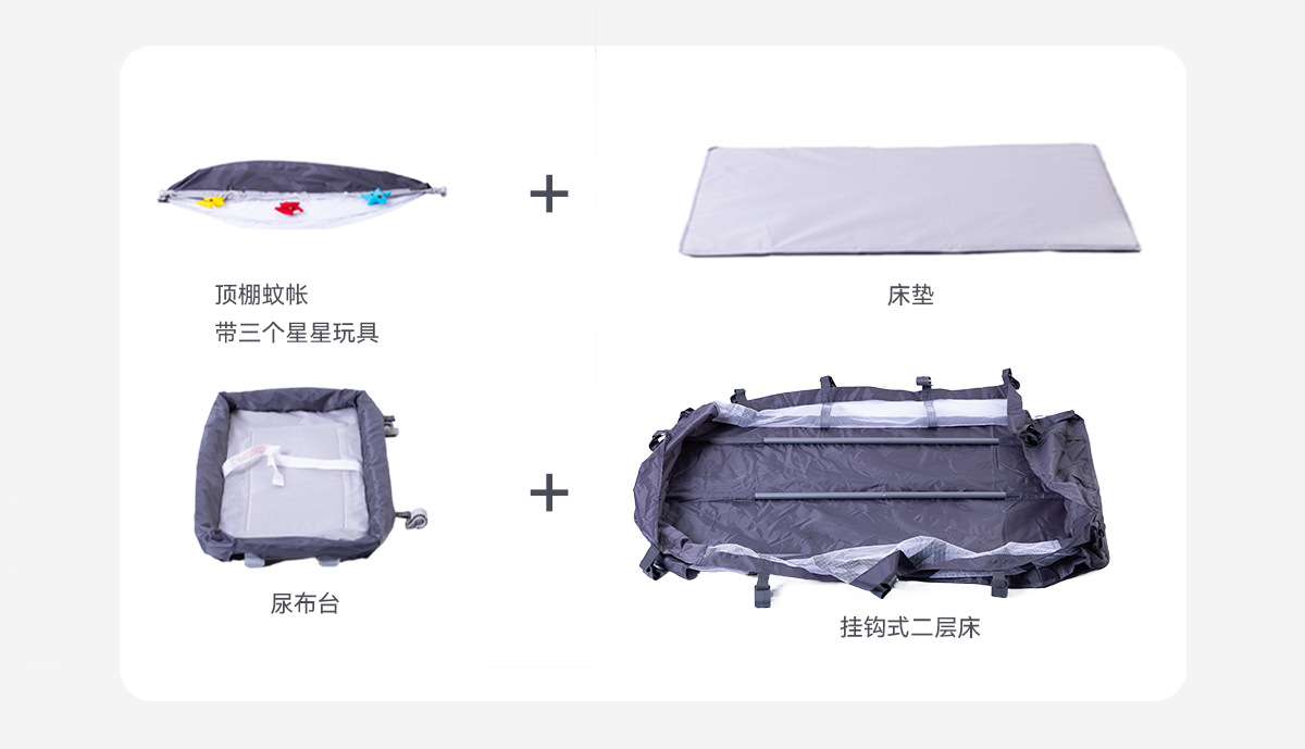 产品配置:基本床+挂钩二层床+尿布架+全篷蚊帐(带星星玩具)+床垫+侧边置物袋+爬爬洞+两个刹车轮+手提收纳袋