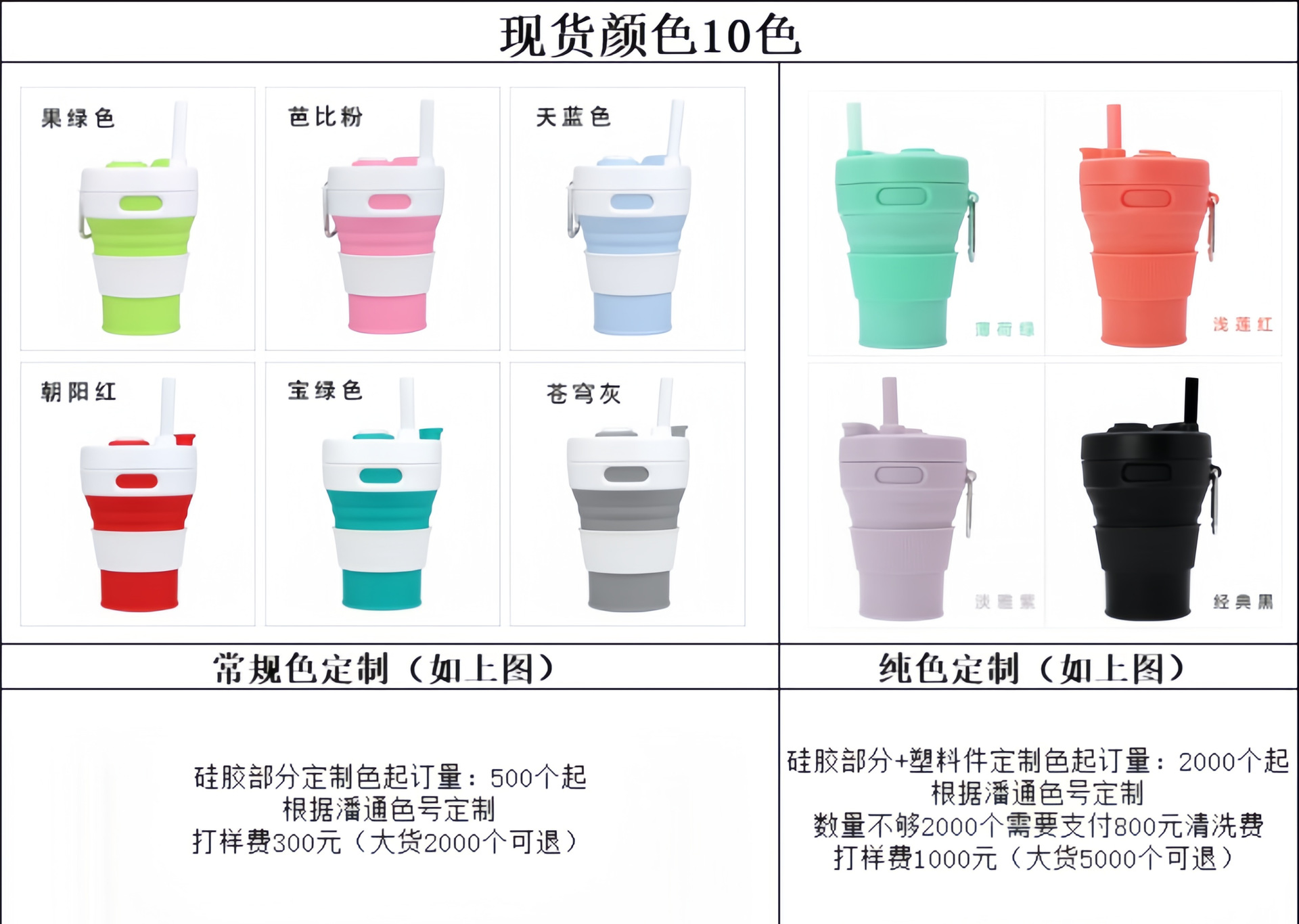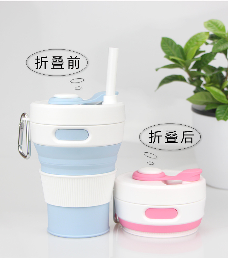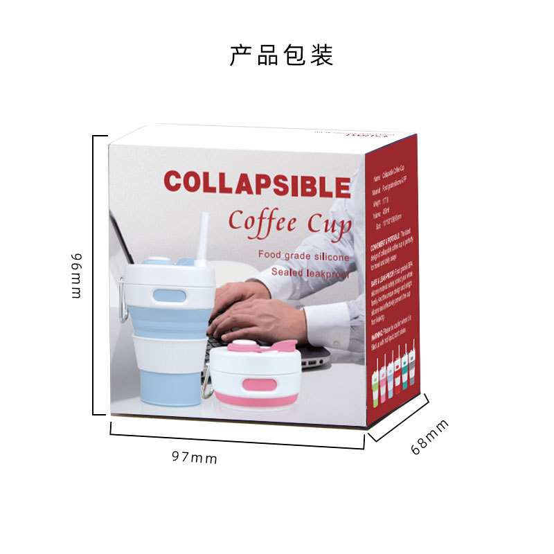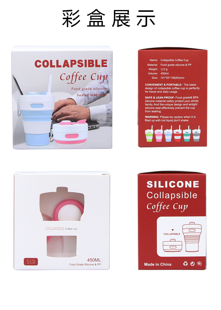 折叠咖啡杯(S12)参数:1.材质:食品级硅胶+聚丙烯PP 2.尺寸:87*140(58)mm 彩盒尺寸:98*98*68mm 3.容量:450ml 4.重量:150g 5.包装:OPP袋子+彩盒 6.箱规:49*33.5*40cm 7.装箱数量100个 8.净重:16kg 毛重:18kg