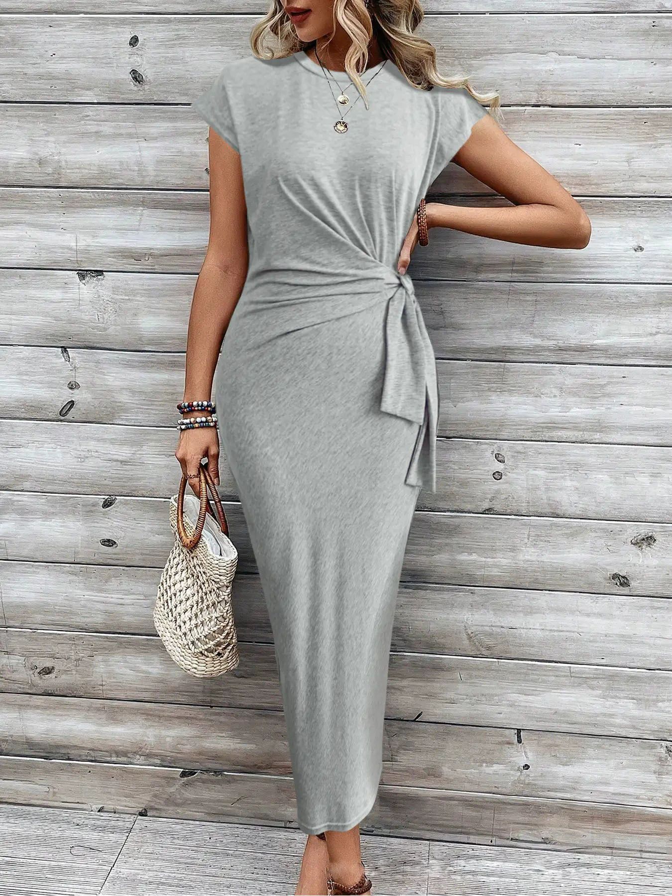 2026 크로스보더 우아한 허리끈 스트라이프 라운드넥 반팔 롱 원피스 여름 여성 고급 의류