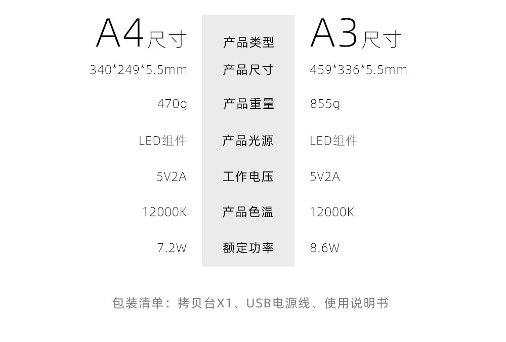 • A4 자기 흡입 복사 테이블 (3 단 기어/무단 디밍) + USB 케이블 + 자석 4 개 + 플러그