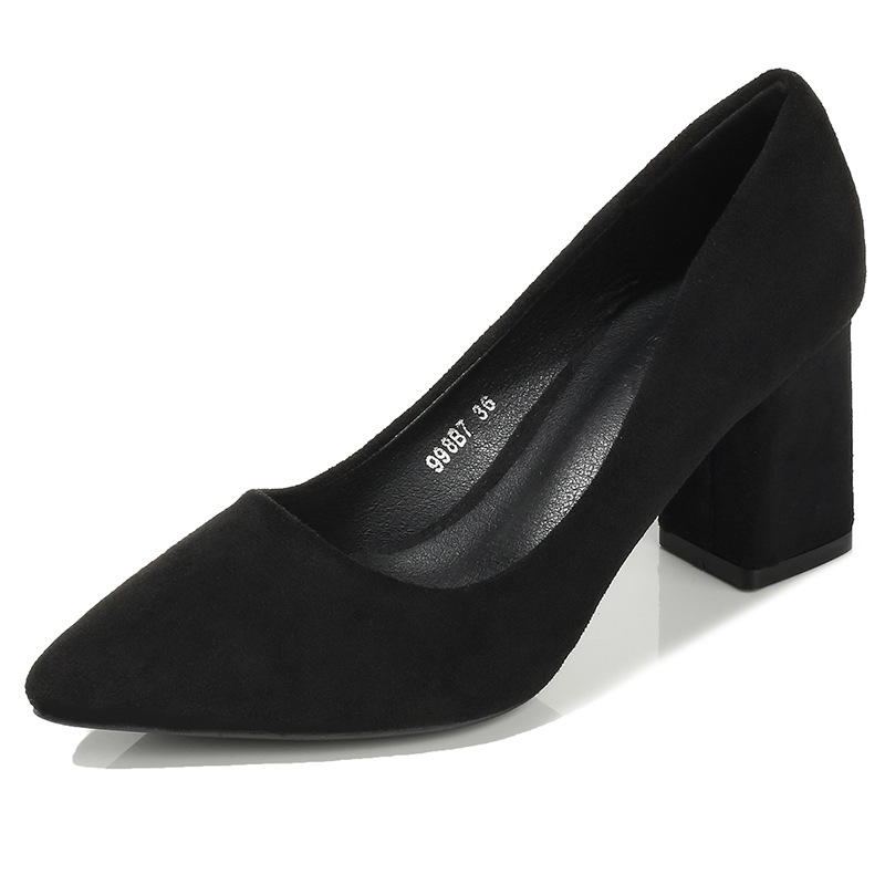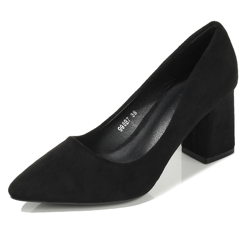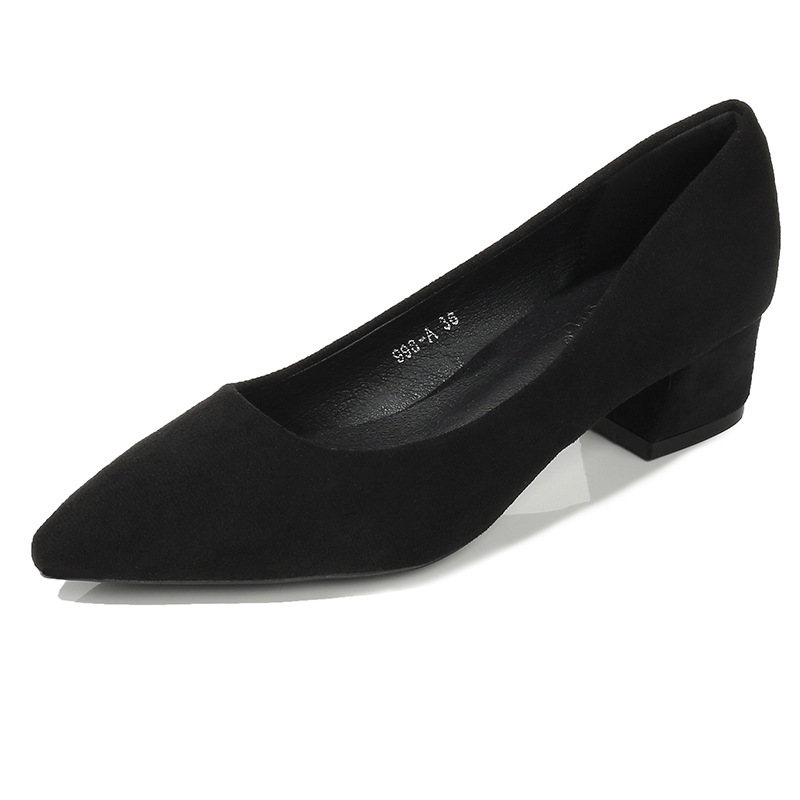 굽 높은 신발 2023 새로운 패션 로우 컷 블랙 스웨이드 청키 힐 여성 신발 사이즈 싱글 레이어 신발 여성 작업 전문 신발스토어 가기