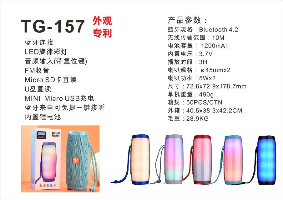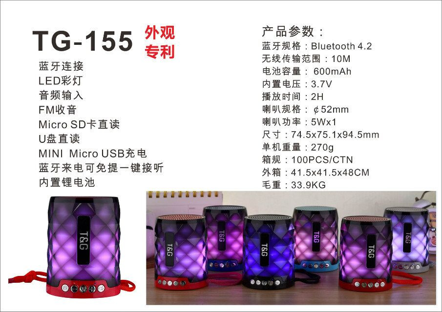 蓝牙功能,支持FM收音,USB,TF卡,AUX,TWS,通话功能,多种幻彩灯LED