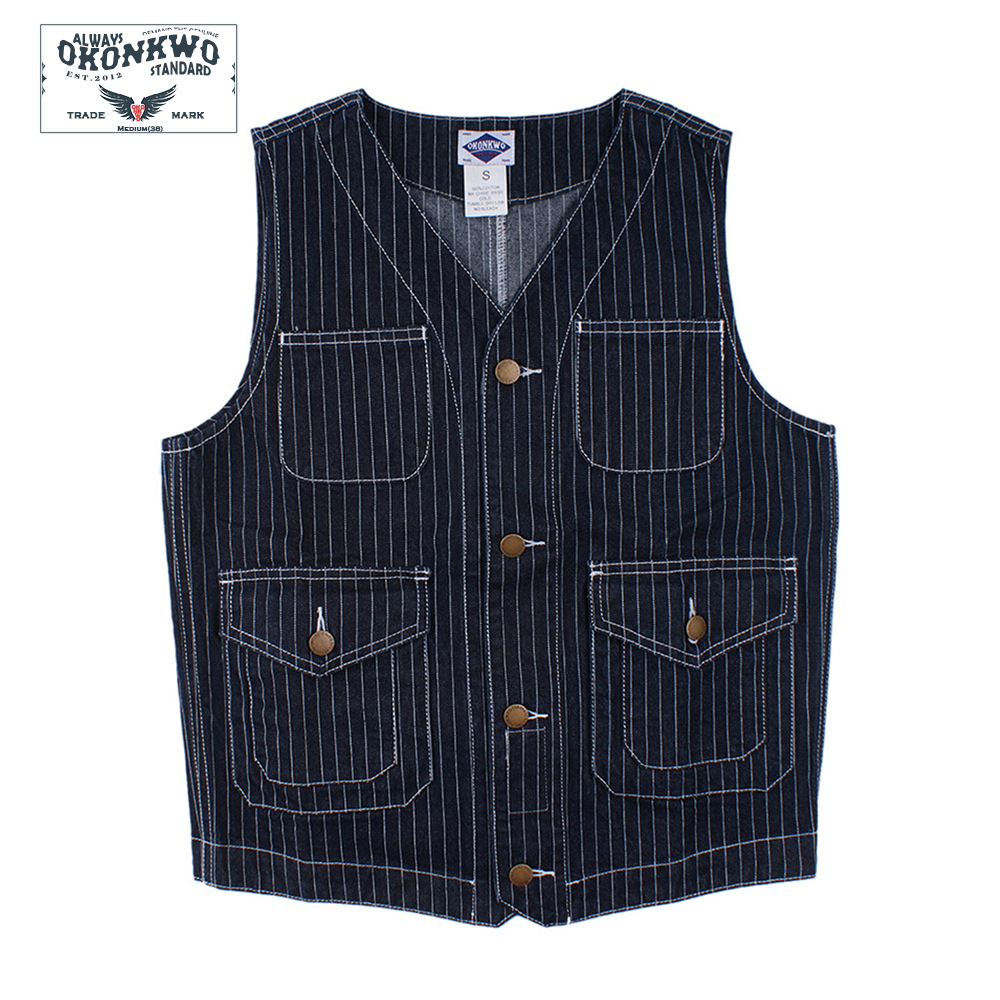 봄 남자의 스트라이프 데님 조끼 Amecarji 빈티지 멀티 포켓 남성과 여성의 작업 조끼스토어 가기