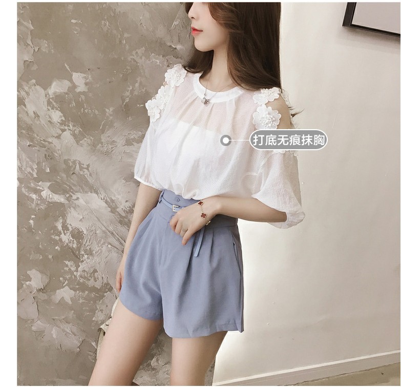 1688 여름옷 한국 스타일 신상 루즈핏 화이트 오프숄더 반팔 쉬폰 셔츠 여성용 다용도 슬림핏 패셔너블 상의