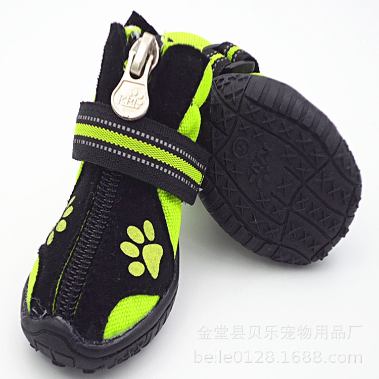 • 产品介绍:牛津布+磨砂面料+牛筋底,鞋身饰片印刷脚印,绑带采用反光织带结合口字扣做法,狗狗穿上更不容易掉。