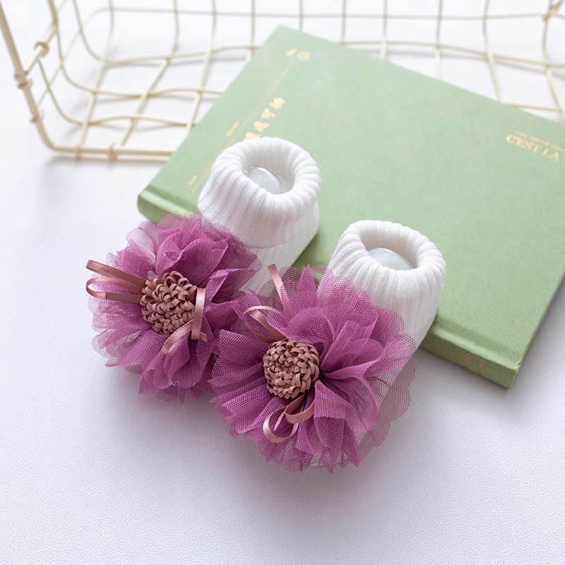 • 더블 바늘 흰색 양말 보라색 꽃