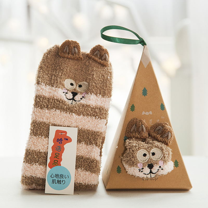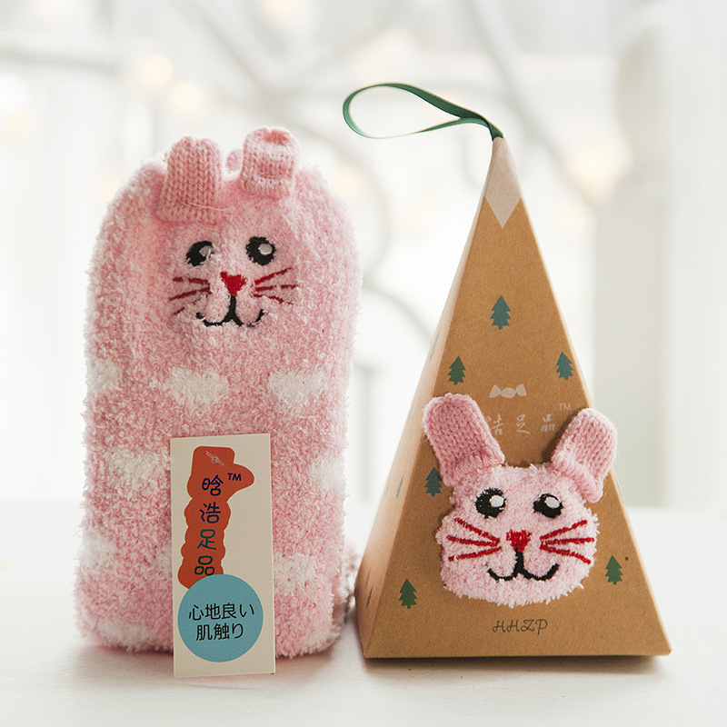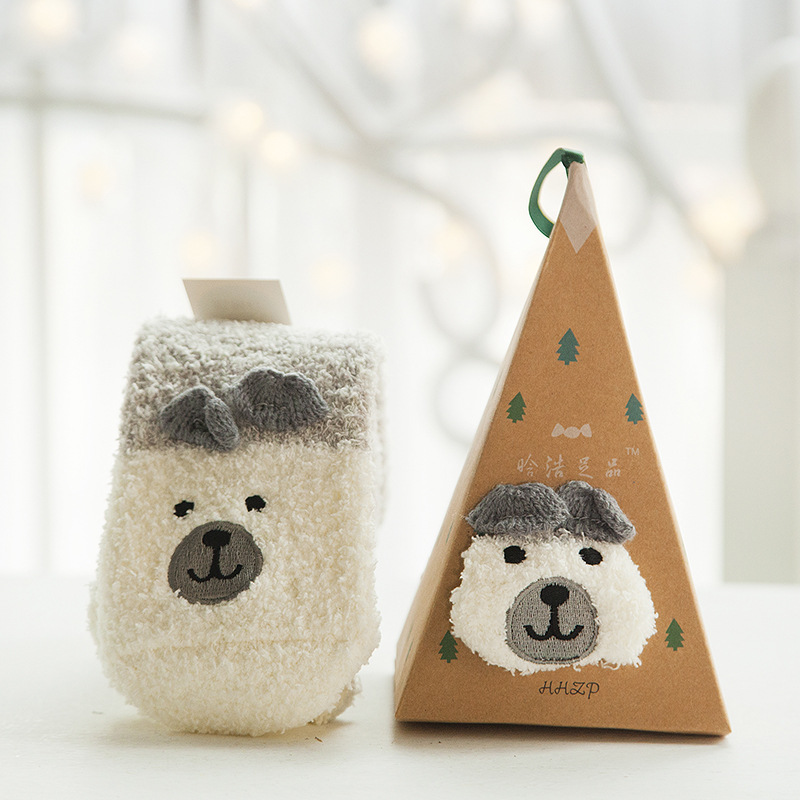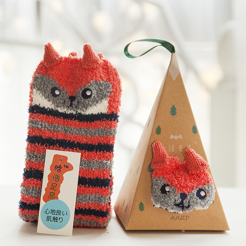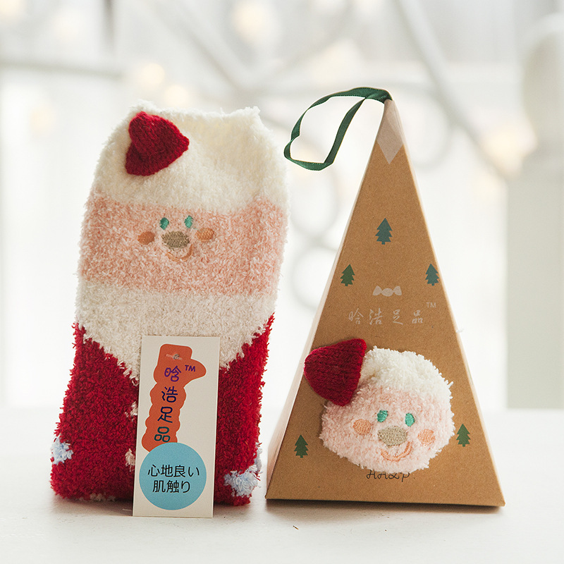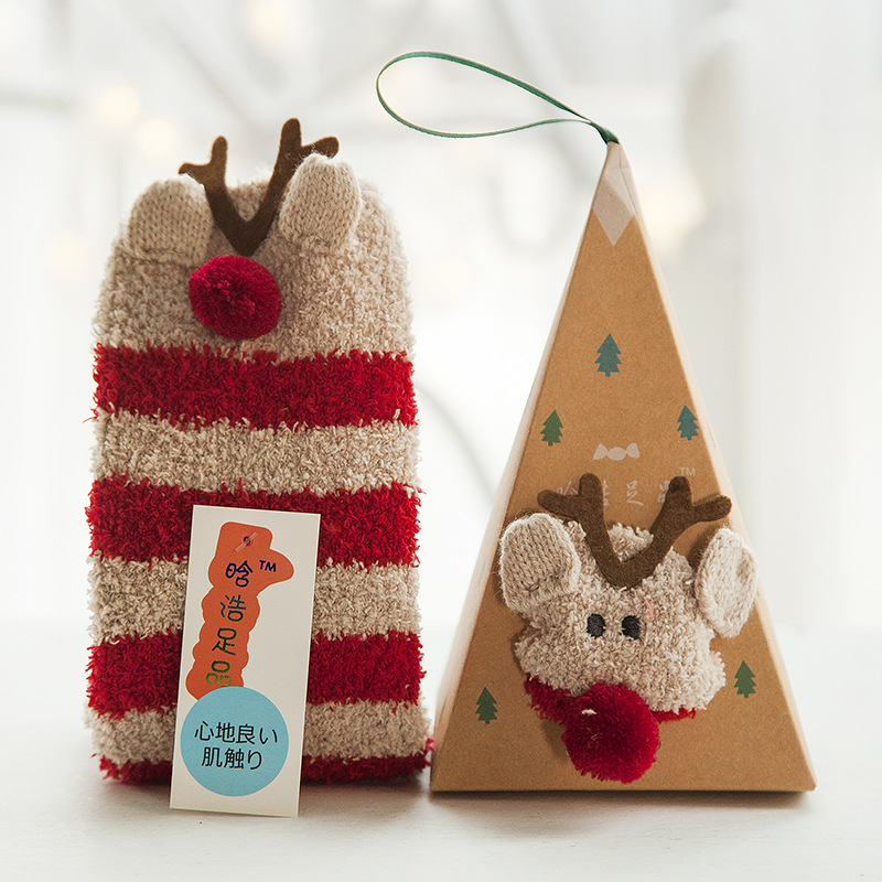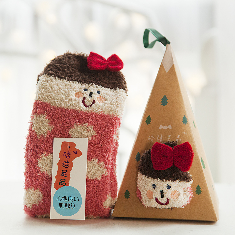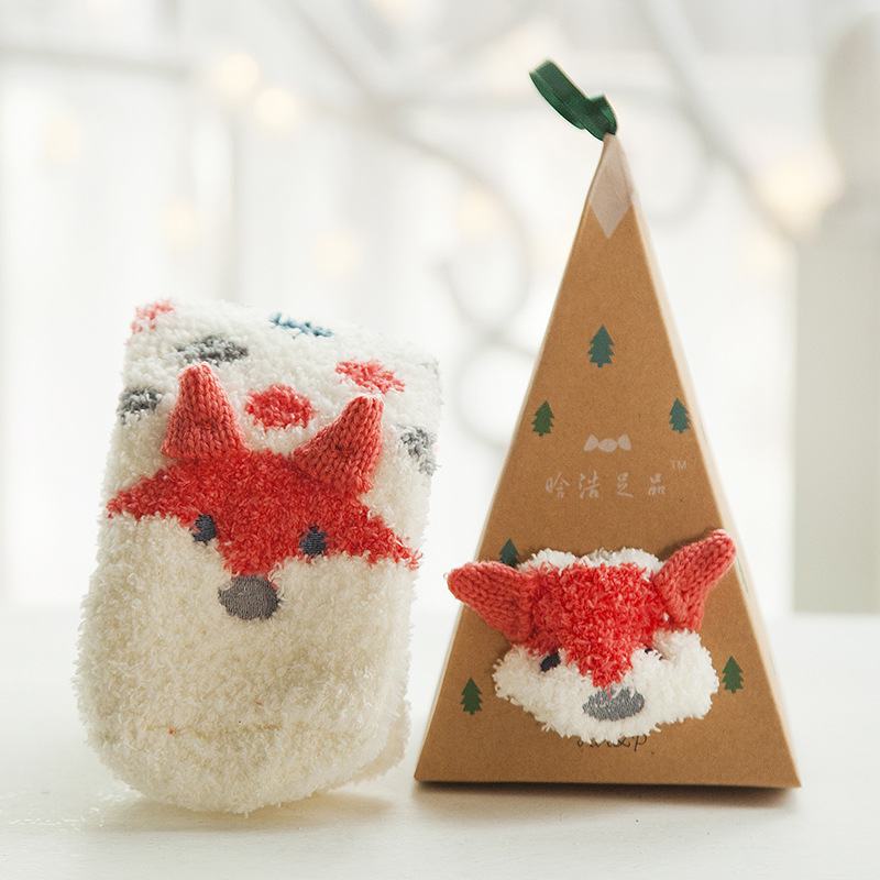 가을과 겨울 새로운 자수 입체 홈 산호 양털 만화 양말 박스형 바닥 양말 반 양털 여성 양말 크리스마스 양말