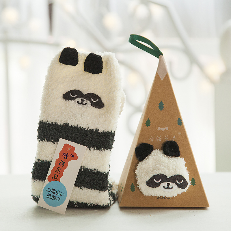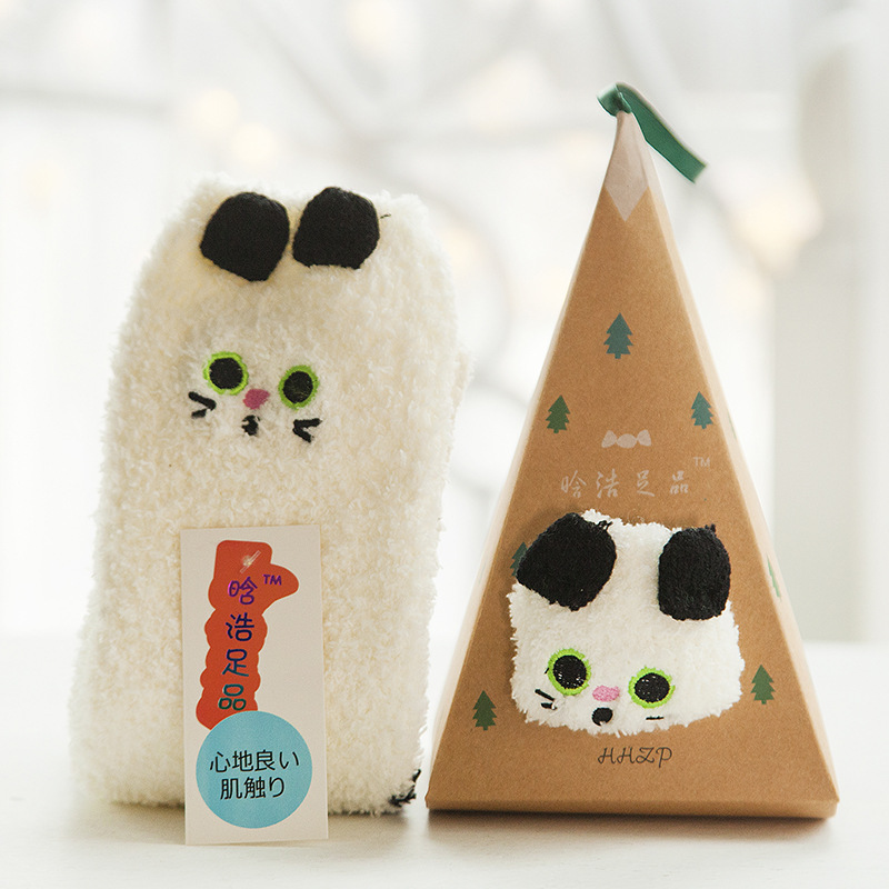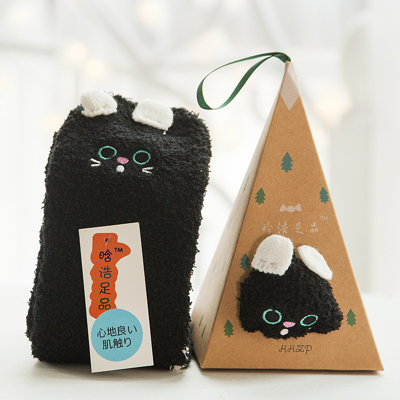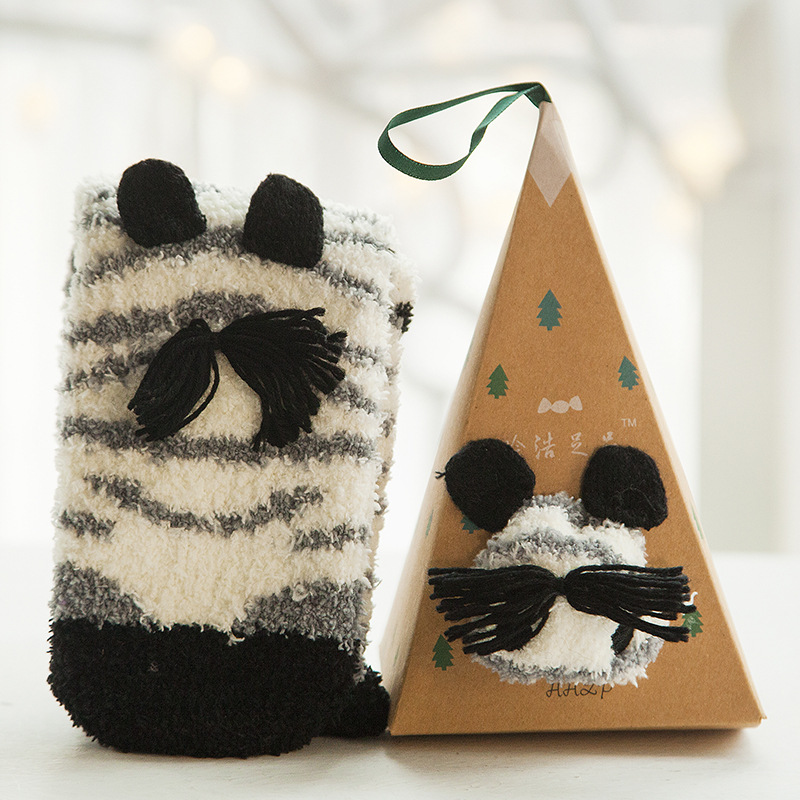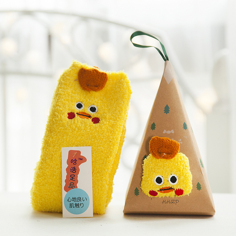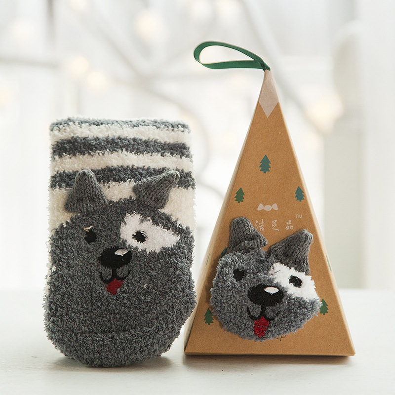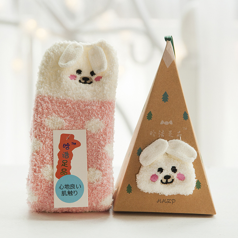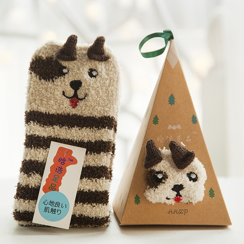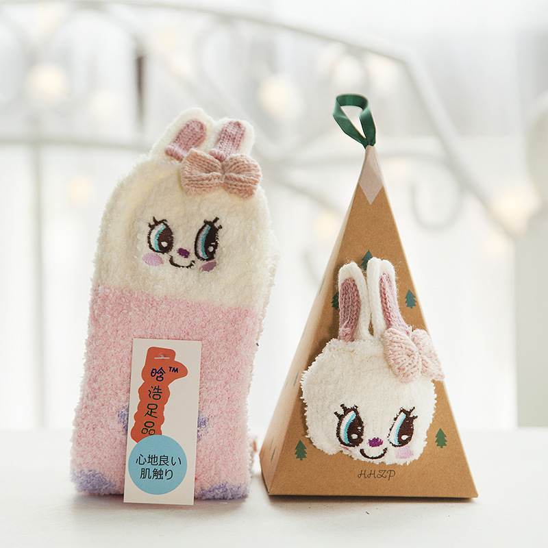 가을과 겨울 새로운 자수 입체 홈 산호 양털 만화 양말 박스형 바닥 양말 반 양털 여성 양말 크리스마스 양말