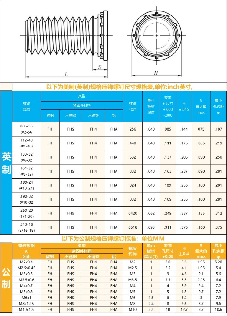 FHS-M3-6 ~ 30 스테인레스 스틸 304 압력 리벳 팅 나사 압력 플레이트 나사 섀시 판금 나사