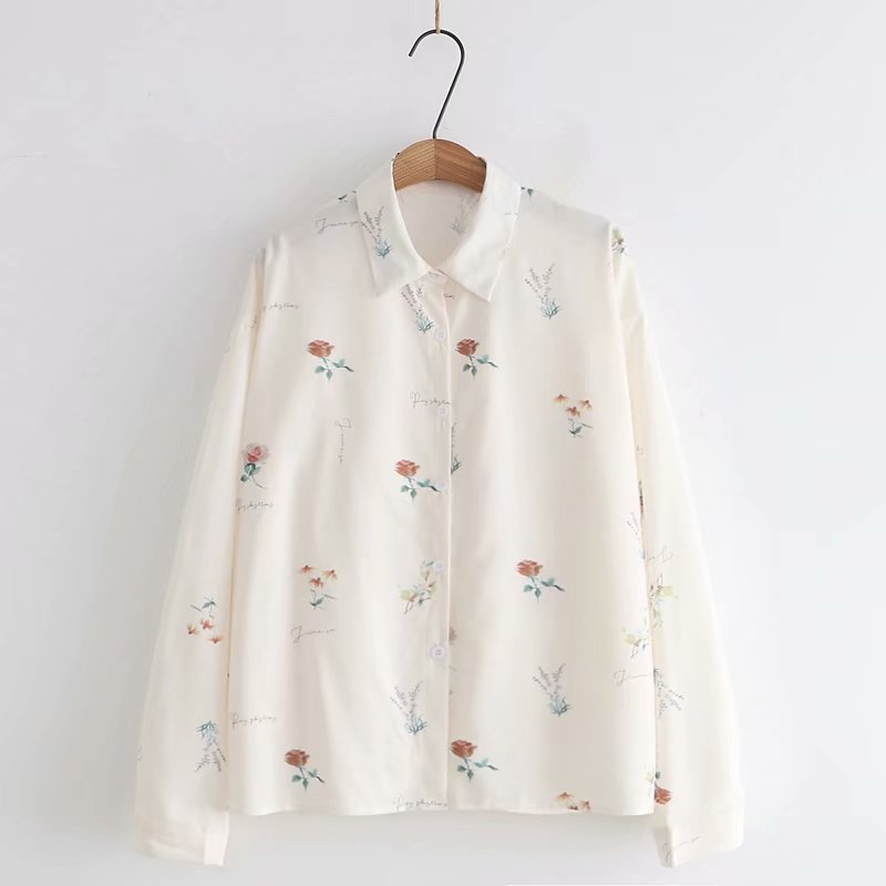 일본의 작은 신선한 꽃 인쇄 베이지 느슨한 긴 소매 쉬폰 셔츠 여성 도매 57352