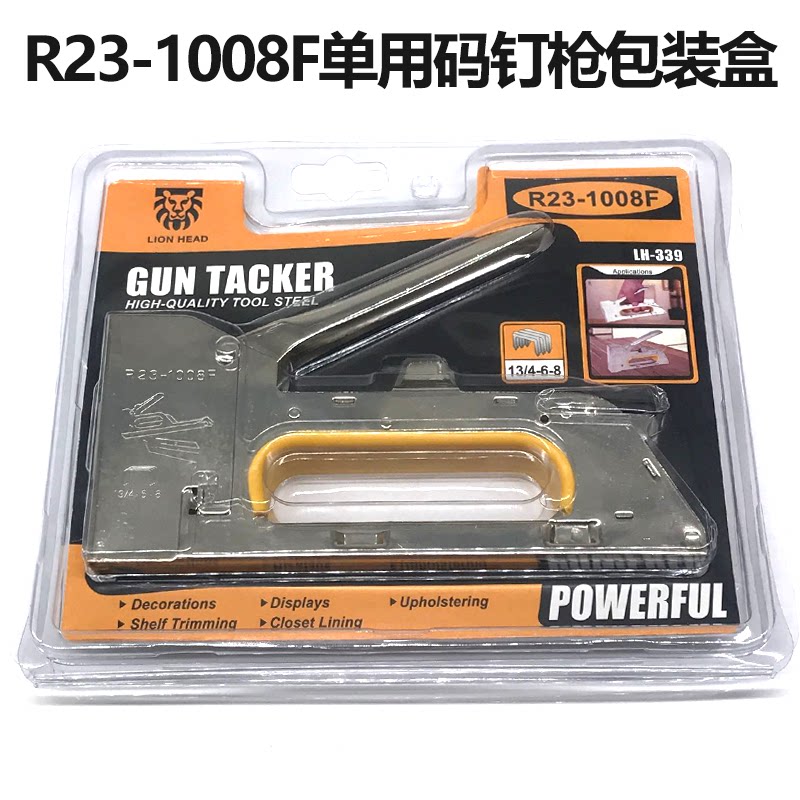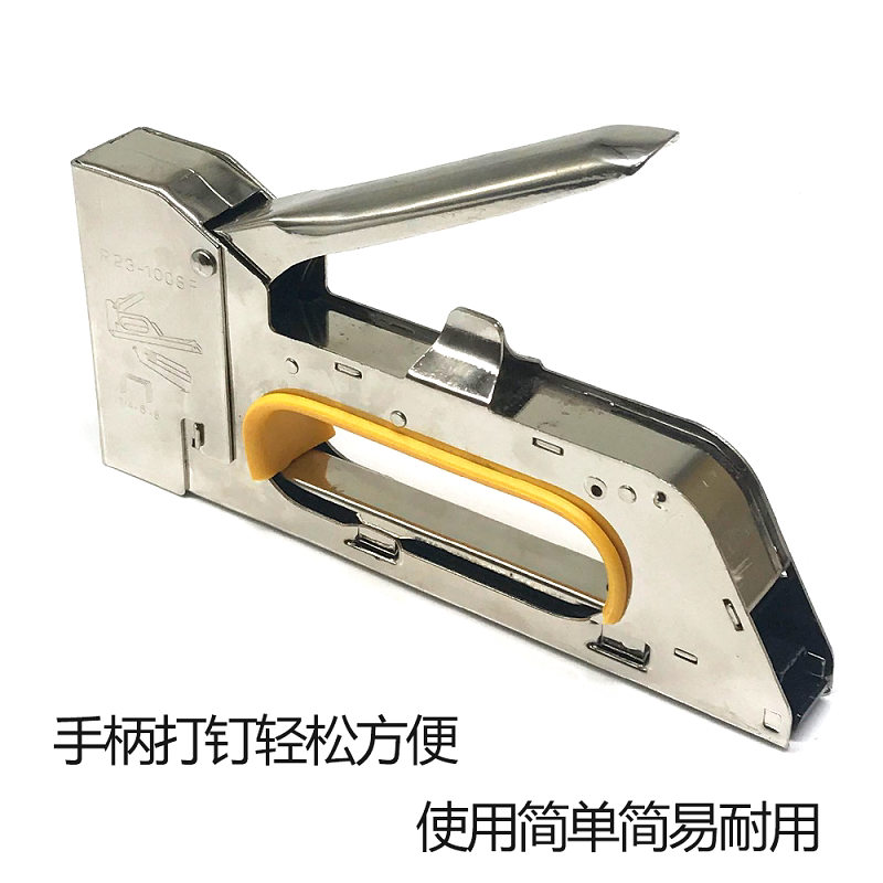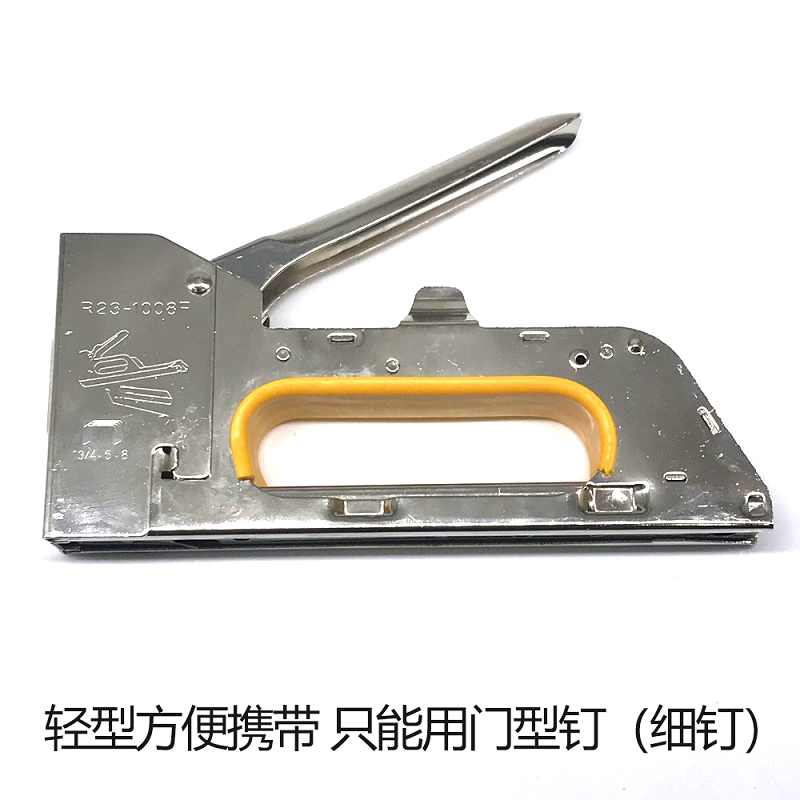 使用说明:此枪不需要空压机供气,只要把适合的枪钉装在枪槽内即可使用,属于便利的手动钉枪,另外它的体积不是很大,携带起来都比较方便!可用于装潢、广告设计、招牌、沙发、椅子、上坐垫子、书架、厨架、衣柜广告布的装订,画布钉在画框上,宝贝纯金属制造,不易损坏!