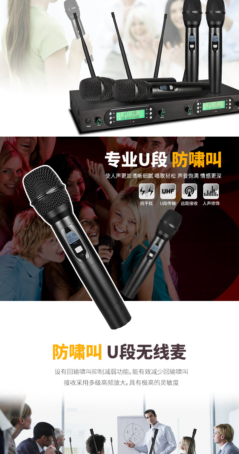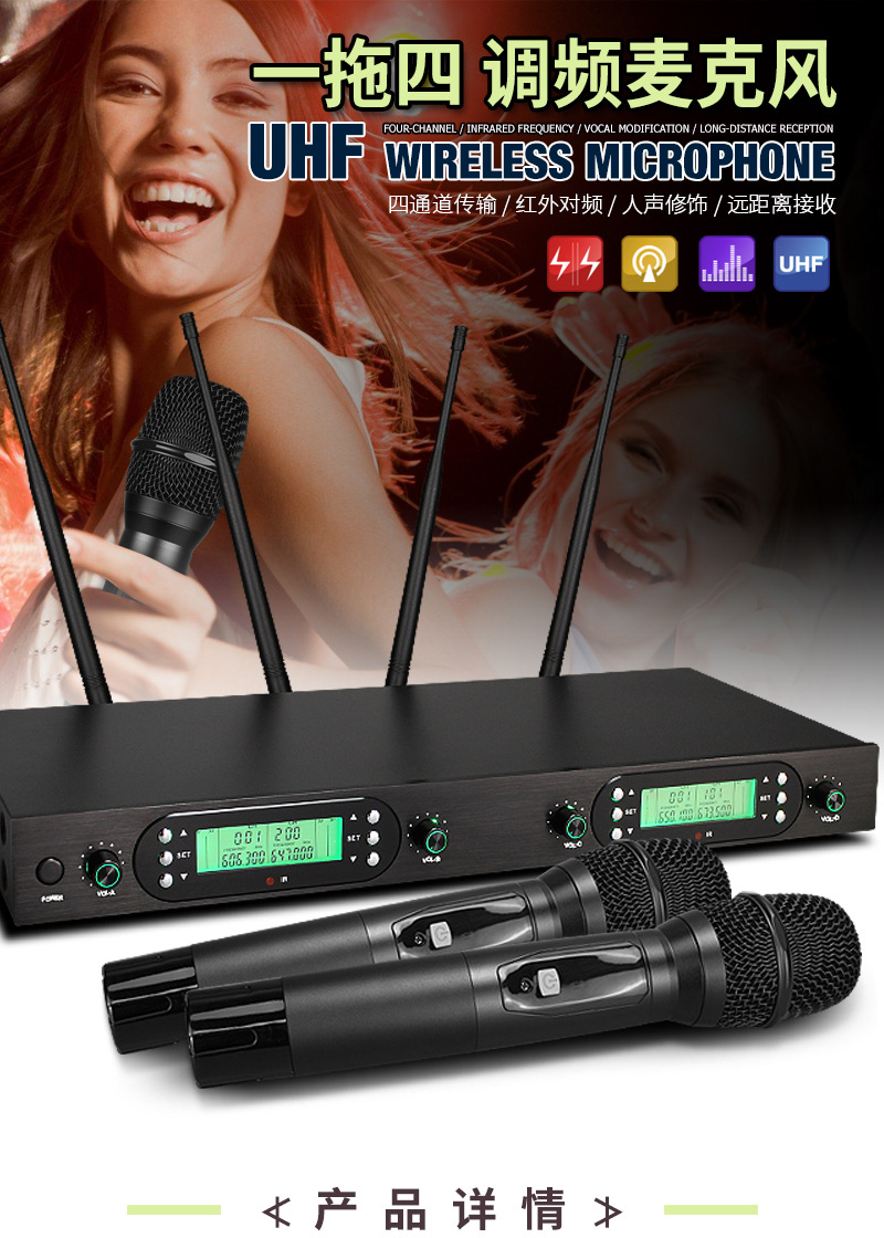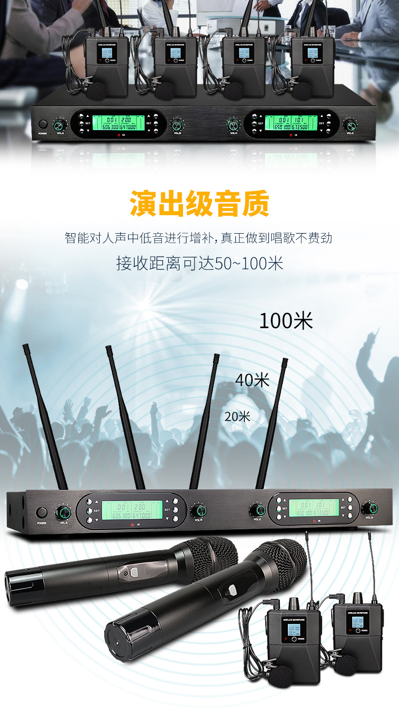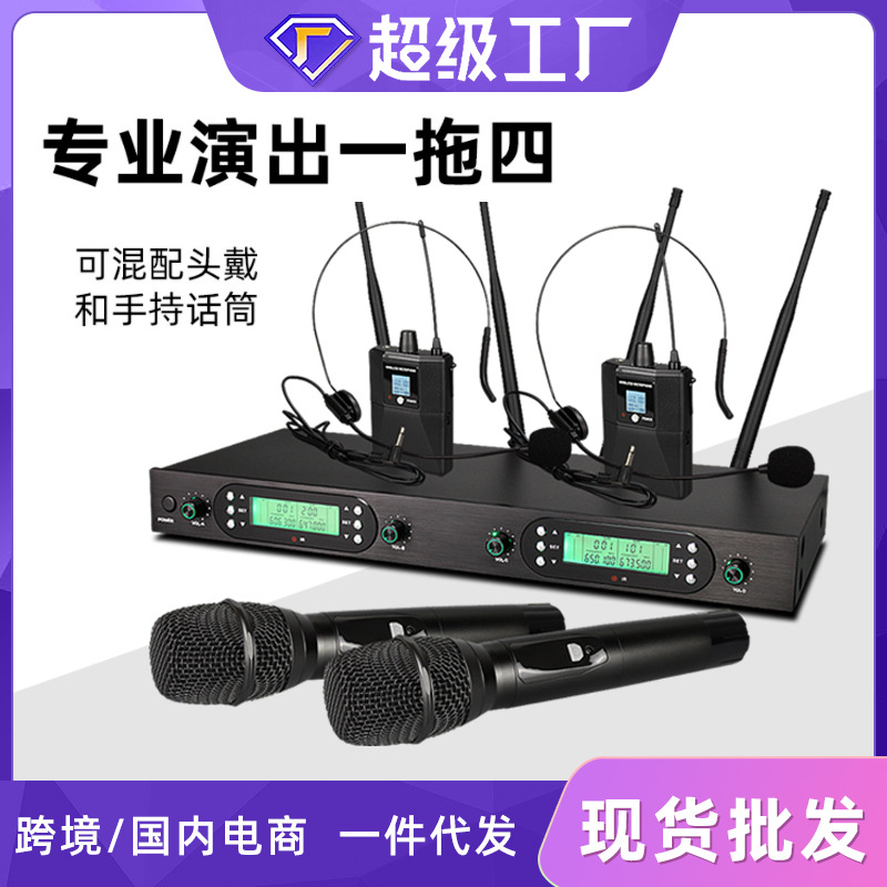 FM U-밴드 스크린 탑재 무선 마이크 1대4 전문 무대 공연 회의용 마이크 사운드 카드 공연 전용