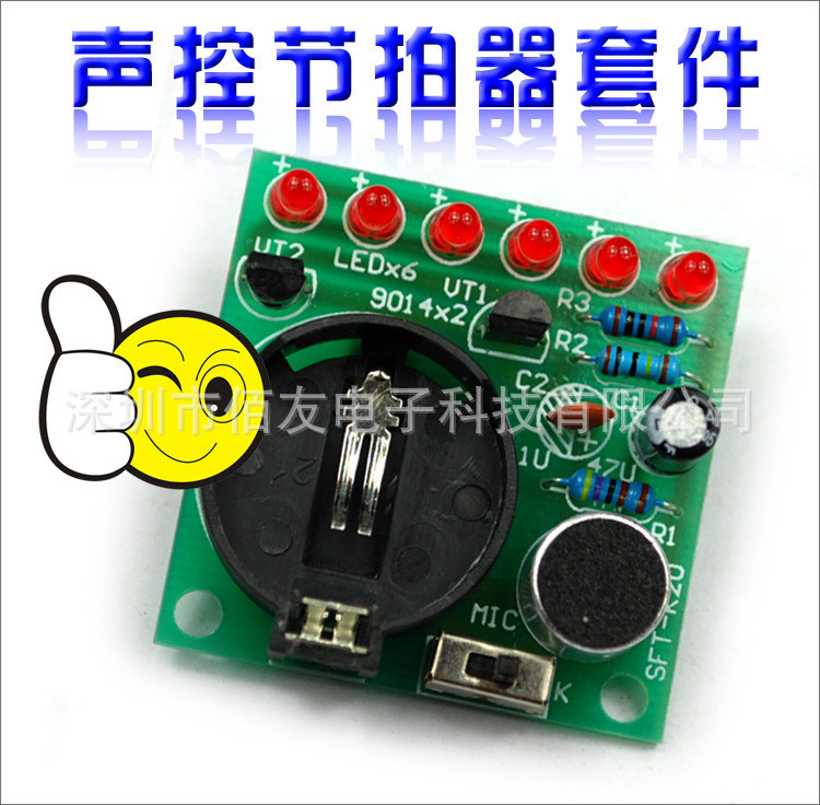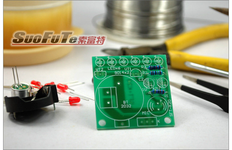 SFT-K20声控LED节拍灯由电源电路、话筒放大电路、LED发光电路组成,采用3V电源供电。MIC将声音信号转化为电信号,经C2耦合到VT1放大,放大后的信号送到VT2基极,由VT2推动发光二极管发光,声音越大,LED亮度越高。
