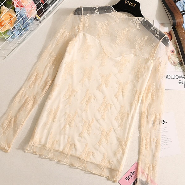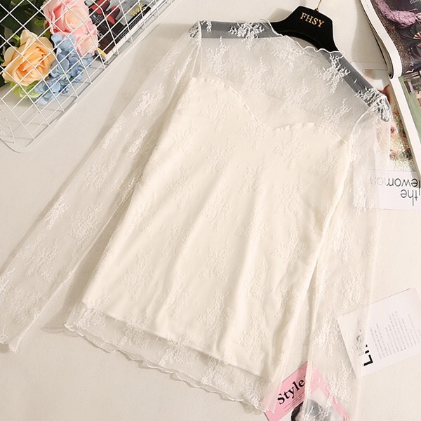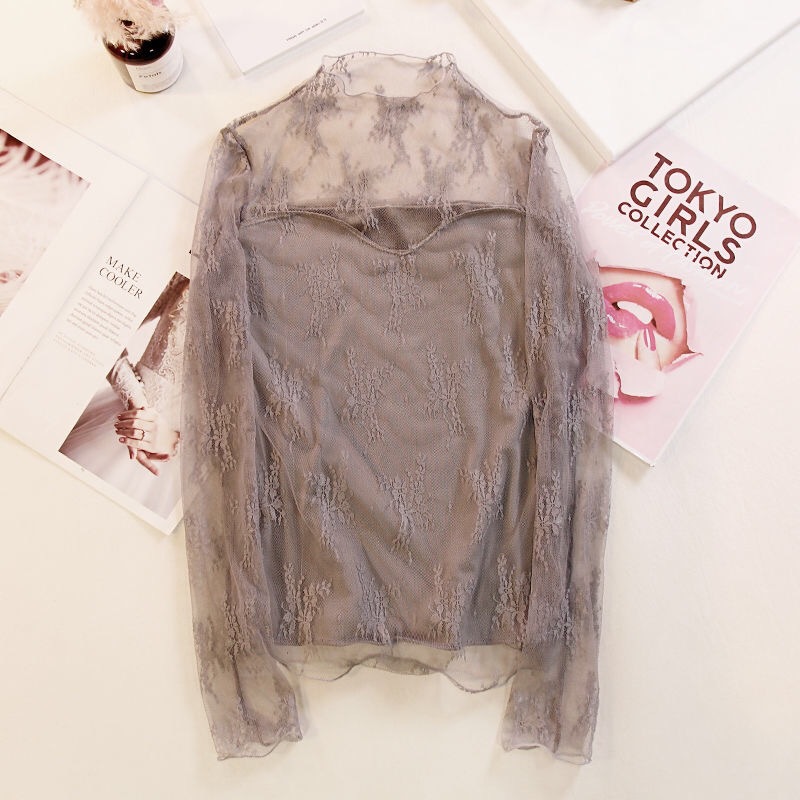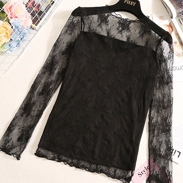 기모 가을과 겨울 새로운 레이스 베이스 셔츠 여성용 긴팔 메쉬 티셔츠 슬림핏 탑 시스루 중공 셔츠