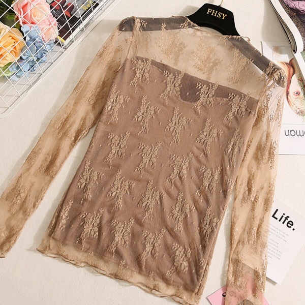 기모 가을과 겨울 새로운 레이스 베이스 셔츠 여성용 긴팔 메쉬 티셔츠 슬림핏 탑 시스루 중공 셔츠스토어 가기