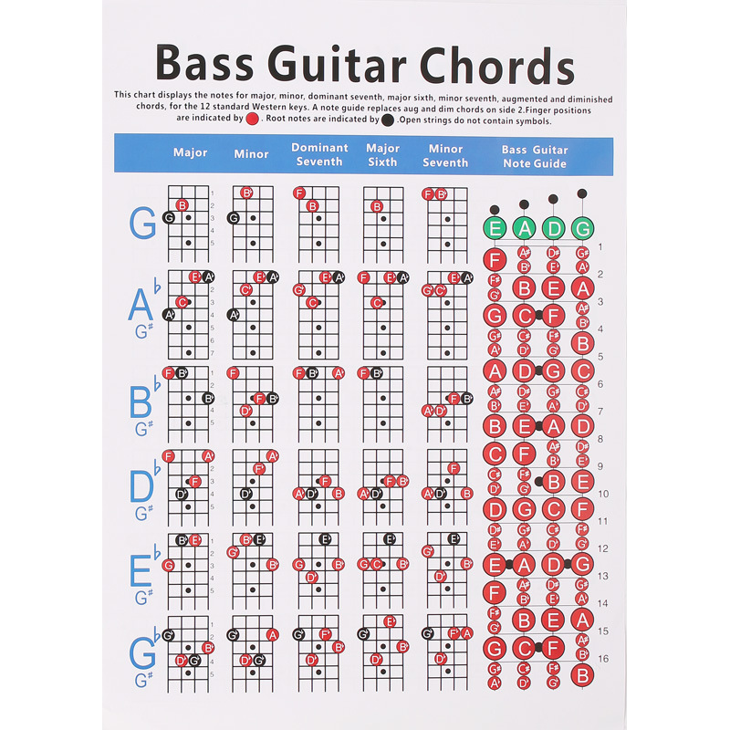 This sized laminated chart displays common note formations for the '4 String' Bass Guitar tuned to E, A, D and G.
