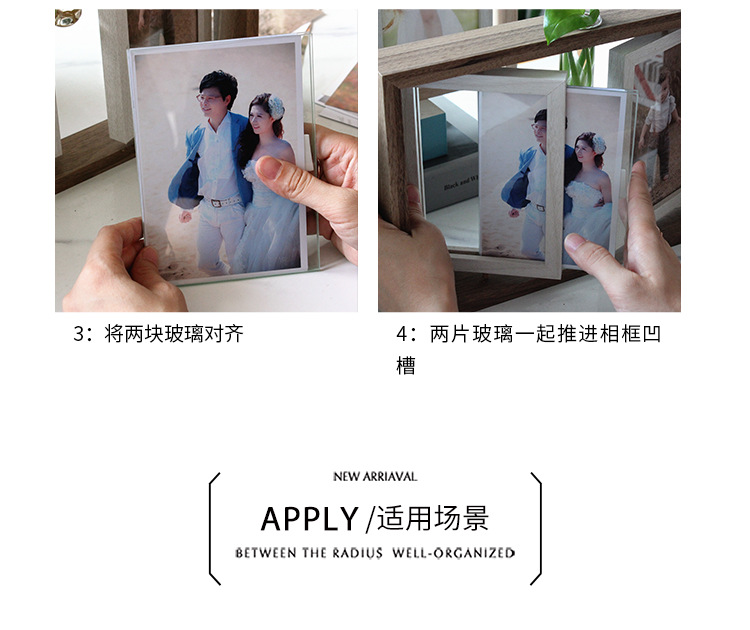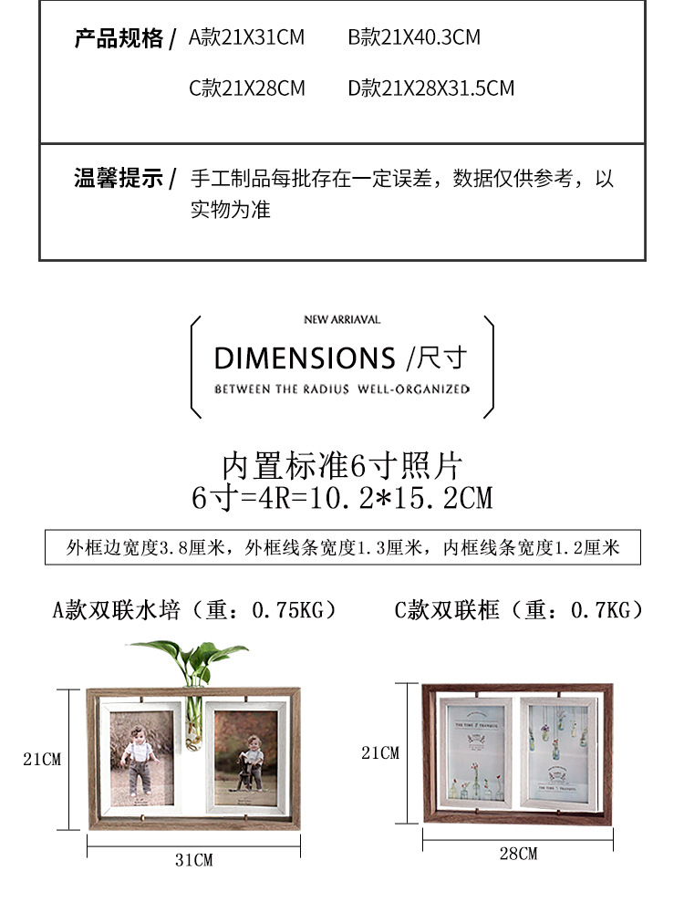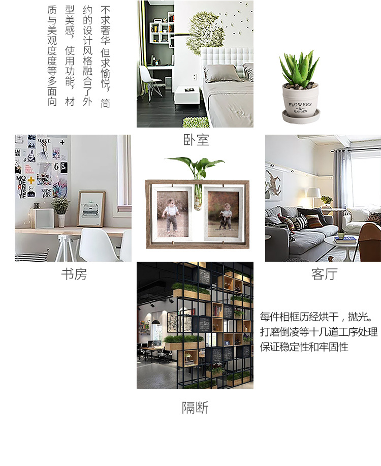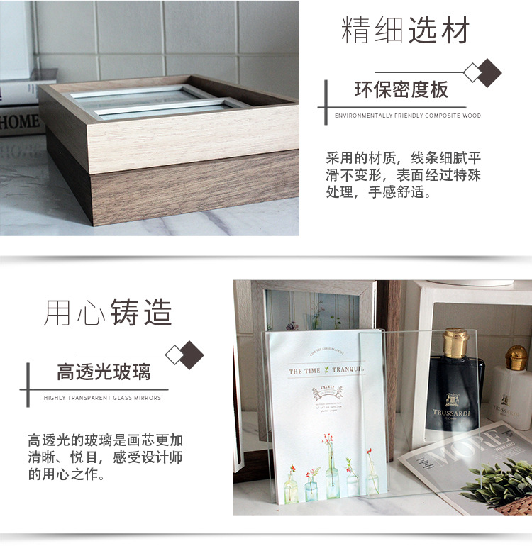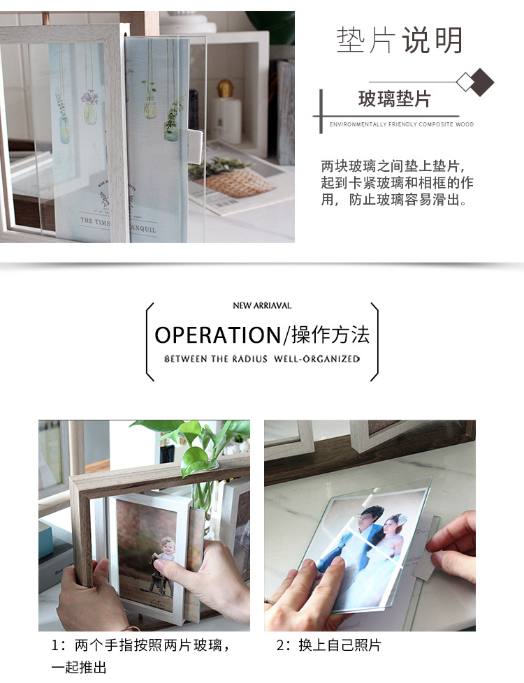 此款北欧风创意组合相框双联三联连体双面照片相框有6寸四个型号,有2种颜色可更换上自己照片,此款照片相框可放四张和6张的照片,是玻璃面,通透有质感,相框厚度有3.8厘米,木质材质十分有质感。好的相框当摆设,会让装修空间更显气质,幽美。此相框也适用于服装店酒吧文艺吧直接做装饰品,本身相纸十分好看文艺,当然影楼照相馆拿来做相框,是相对不错的选择。