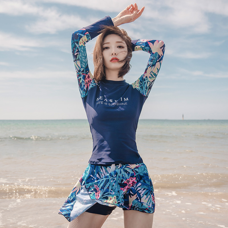 여성용 스포츠 수영복, 한국 인스 스타일 긴팔 상의, 자외선 차단, 배 가리기, 슬림 효과, 보수적, 온천 휴가용 수영복스토어 가기