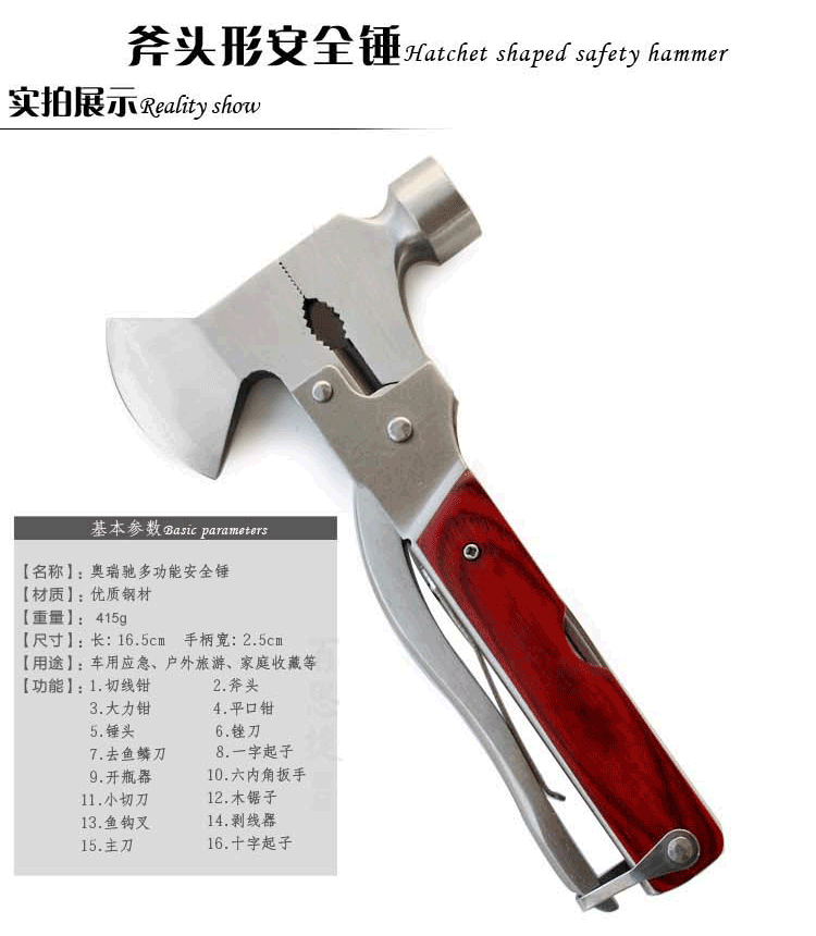 【主要工具】老虎钳、线剪、锤子、刀、十字螺丝刀、锯子、锯齿刀、一字螺丝刀、锉刀、开瓶器等多种功能于一体。