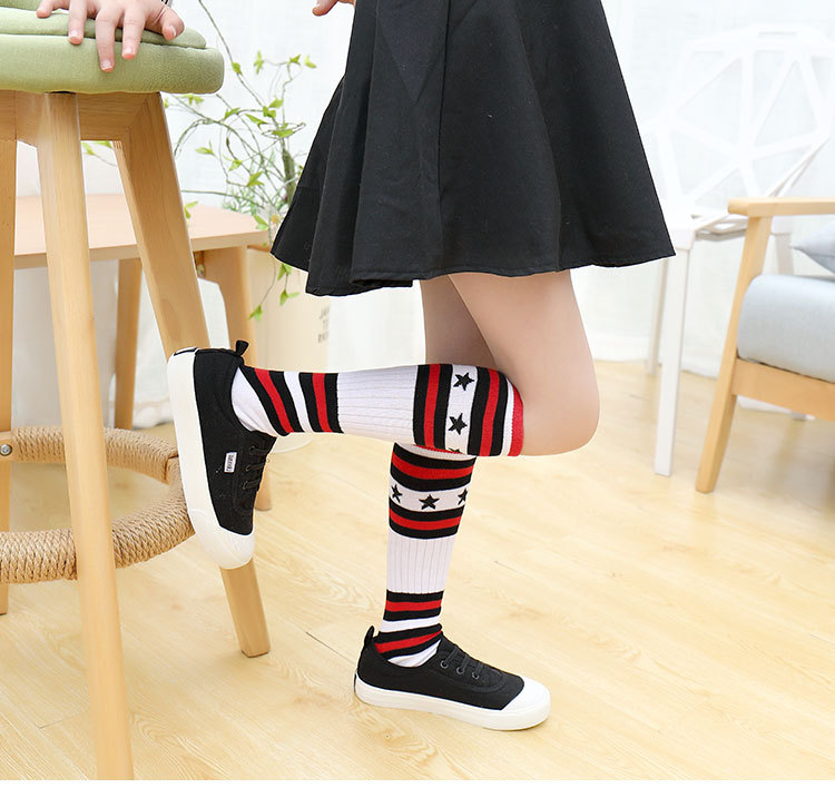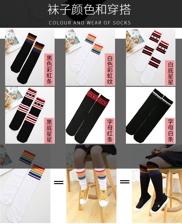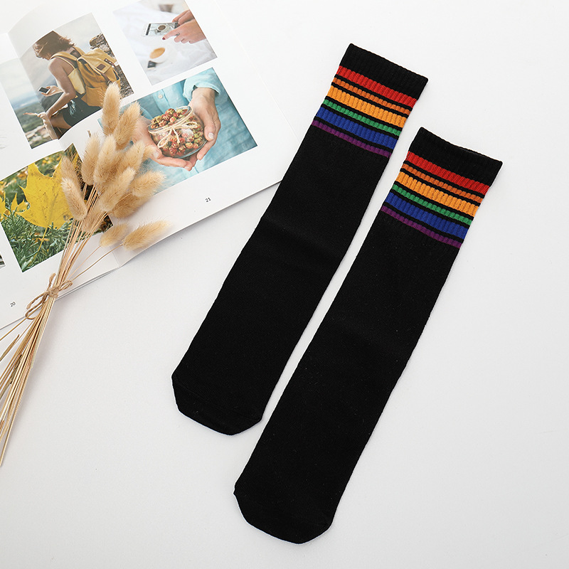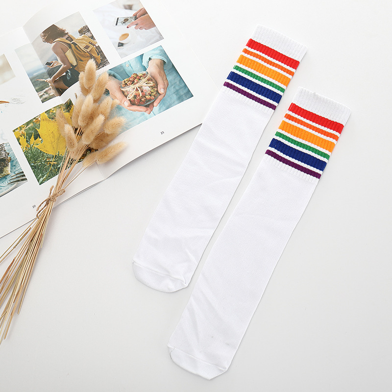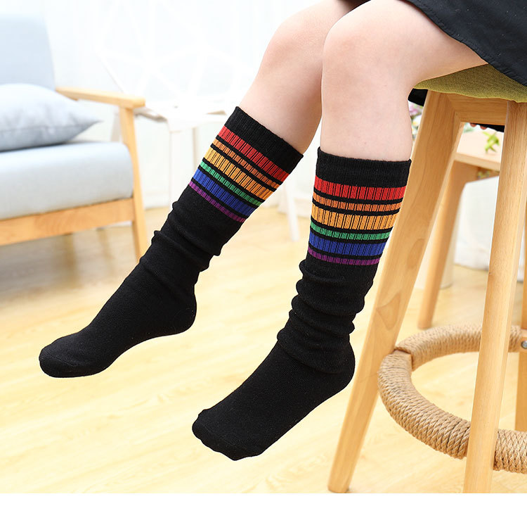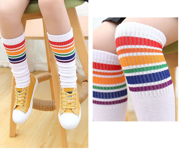 어린이 중간 길이 스타킹 봄과 가을 무지개 줄무늬 스타킹 소녀 높은 스타킹 무릎 높이 학생 스포츠 축구 양말
