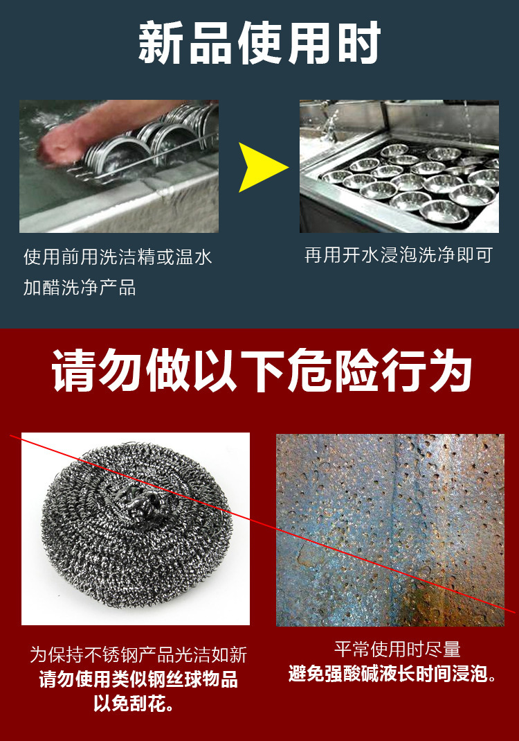 1、不锈钢器皿在使用前,须用开水烫洗几遍,进行高温消毒。