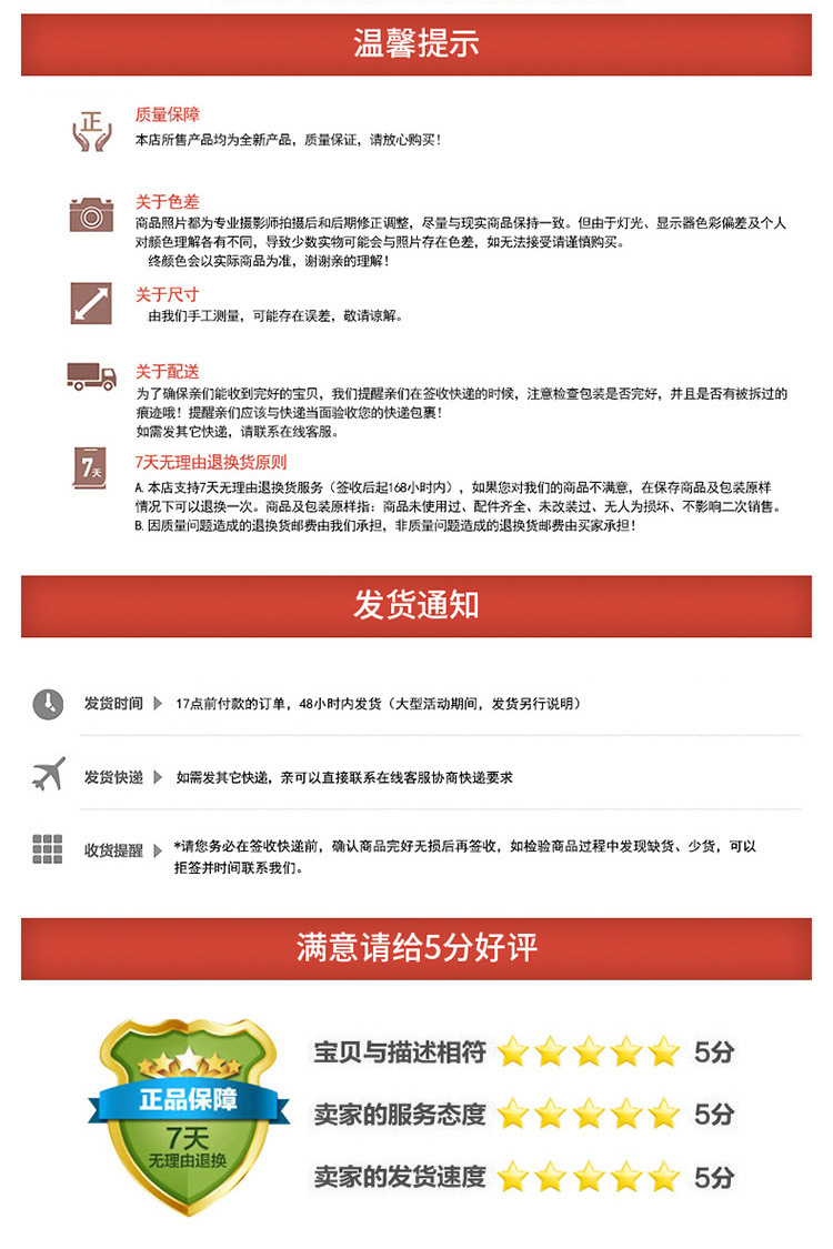 色差问题:100%实物拍摄,因不同灯光显示器可能出现色差,颜色以实物为准。