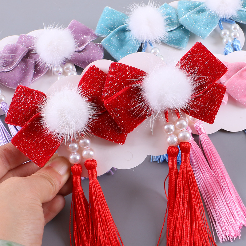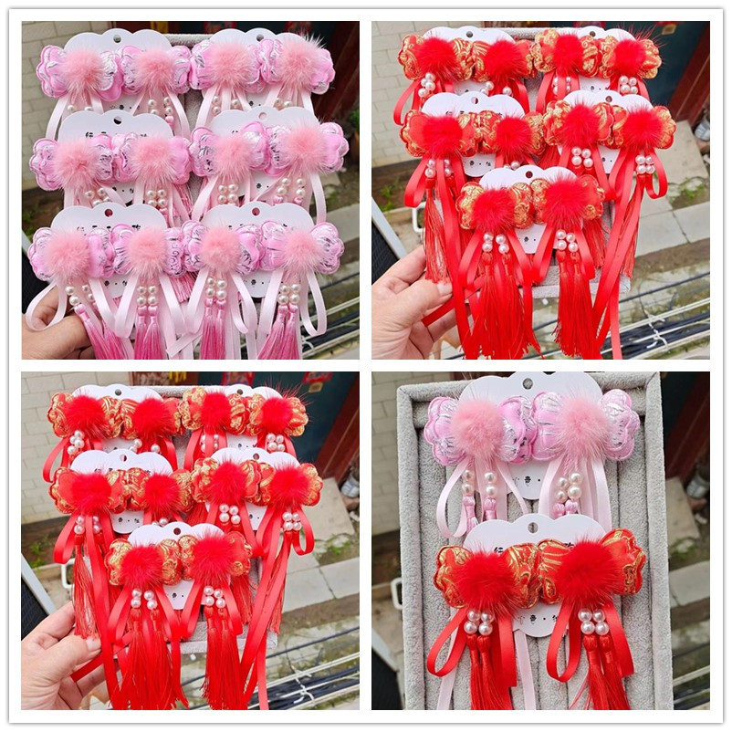 2024中国风发夹儿童古风汉服飘带发夹新年公主中国红色毛球一对价4.4RMB立即购买>