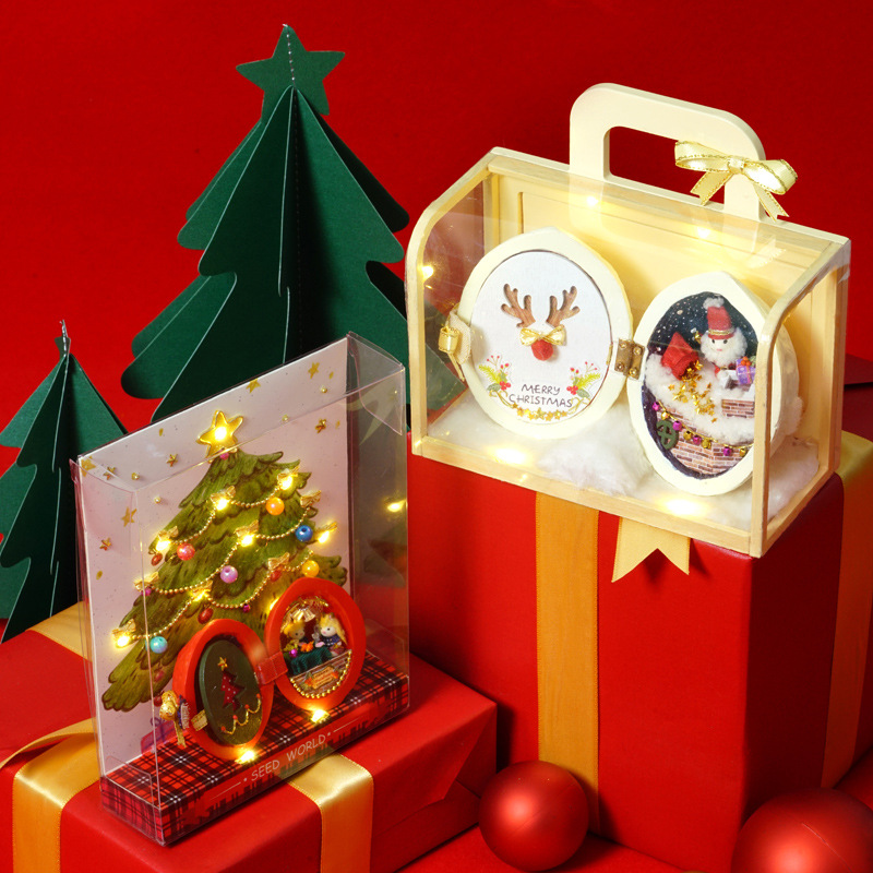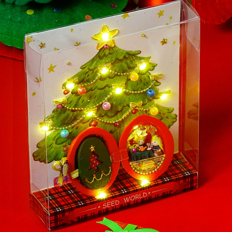 相约圣诞( 自带精美成品树脂外壳,小兔子一对,酒精胶一支,PVC透明胶盒一个,彩色背卡一张,11头LED小串灯1串,电池盒一个.PVC盒子包装与背卡需由消费者按照说明书制作。)