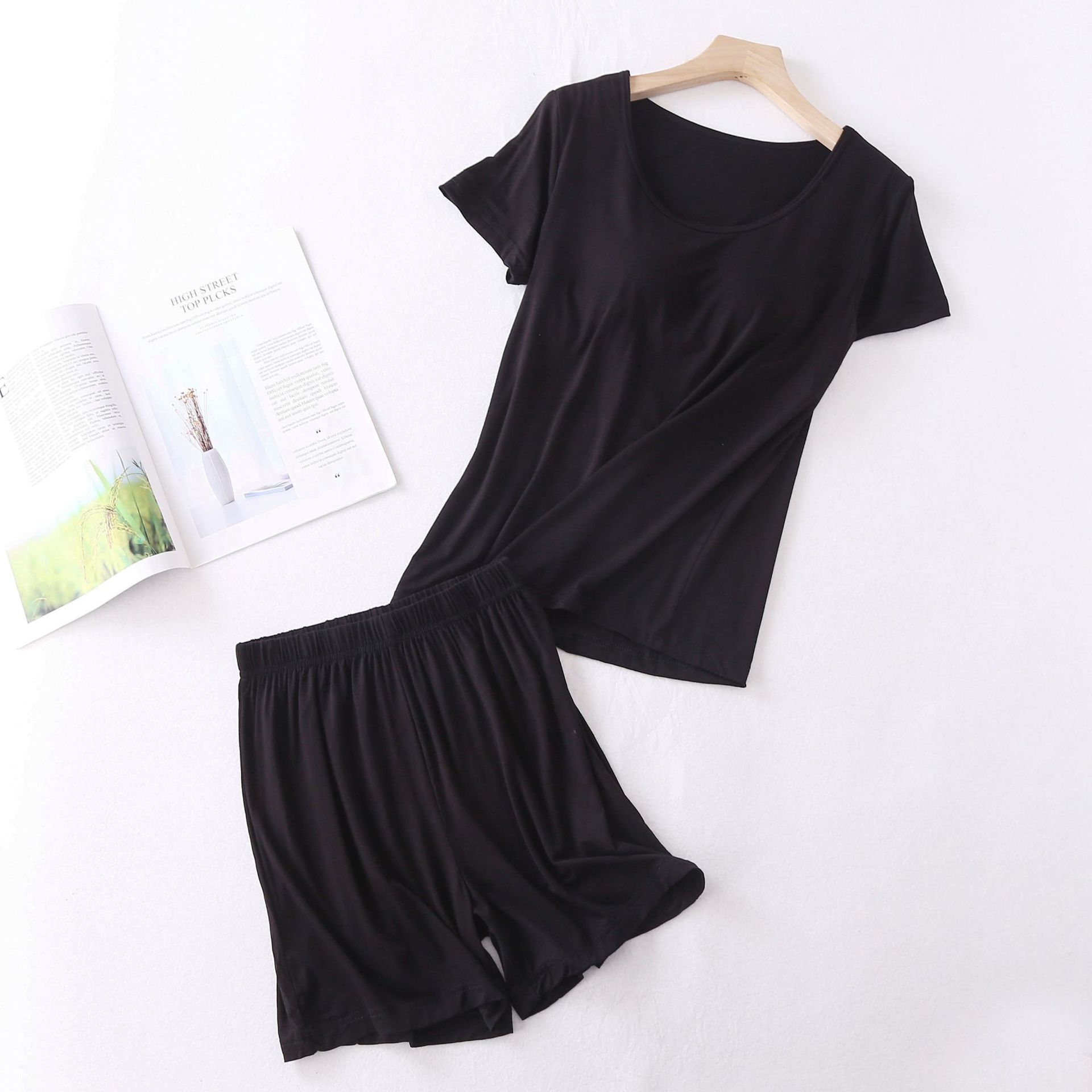 모달 여자의 반팔 잠옷 가슴 패드 세트 다섯 손가락 컵 플러스 사이즈 무료 브래지어 반 소매 느슨한 반바지 가정 옷스토어 가기