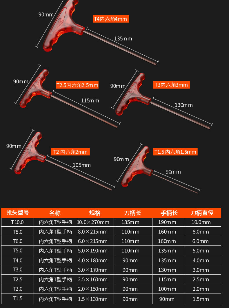 总共九个规格:T型内六角1.5mm;T型内六角2.0mm;T型内六角2.5mm;T型内六角3.0mm;T型内六角4.0mm;T型内六角5.0mm;T型内六角6.0mm;T型内六角8.0mm;T型内六角10.0mm;1