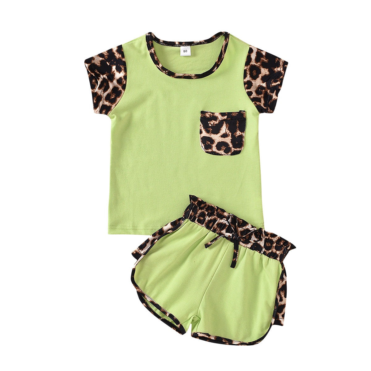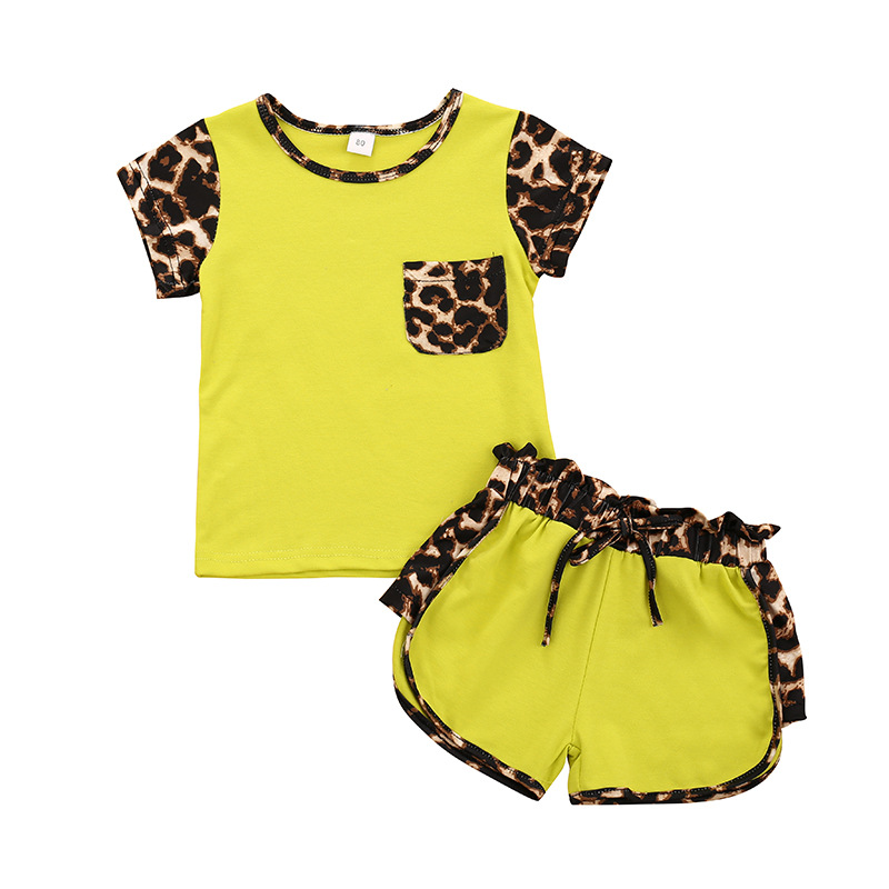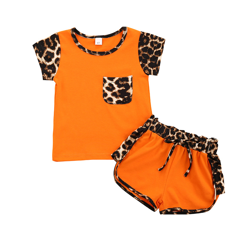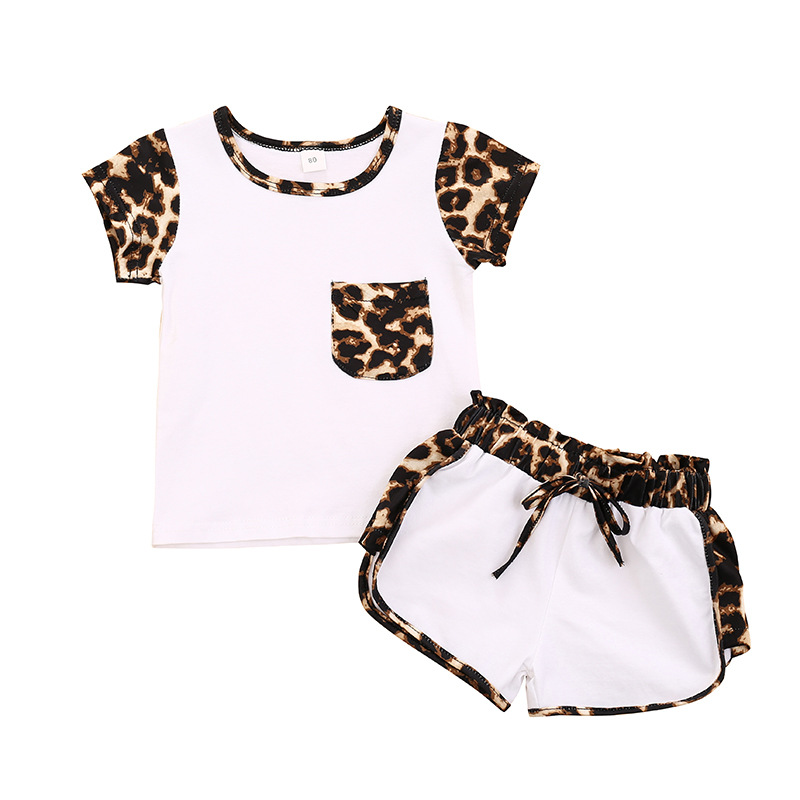 여름 폭발 중소 어린이 소녀 승무원 목 포켓 레오파드 무늬 탑 컬러 매칭 반바지 투피스 세트 한국어 버전