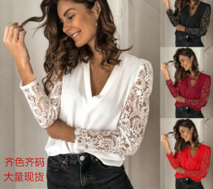 2021跨境外贸新款wish亚马逊ebay拼接蕾丝长袖修身打底衫女装5090