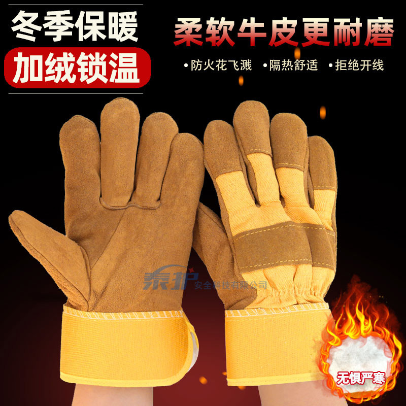 겨울 따뜻한 기모 2 층 소 가죽 용접 장갑 절반 가죽 용접기 펑크 방지 두껍게 한 방한 취급 노동 보호 장갑