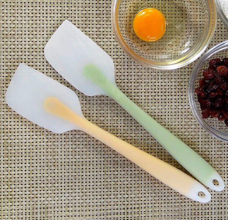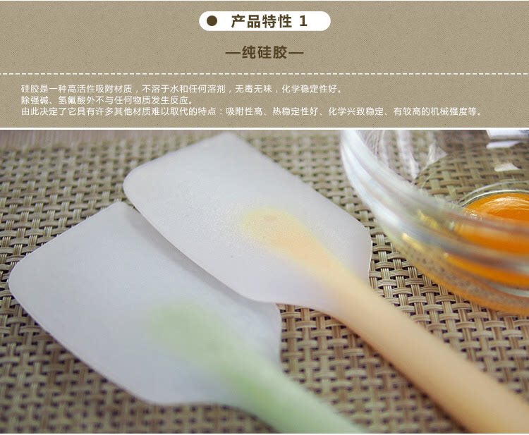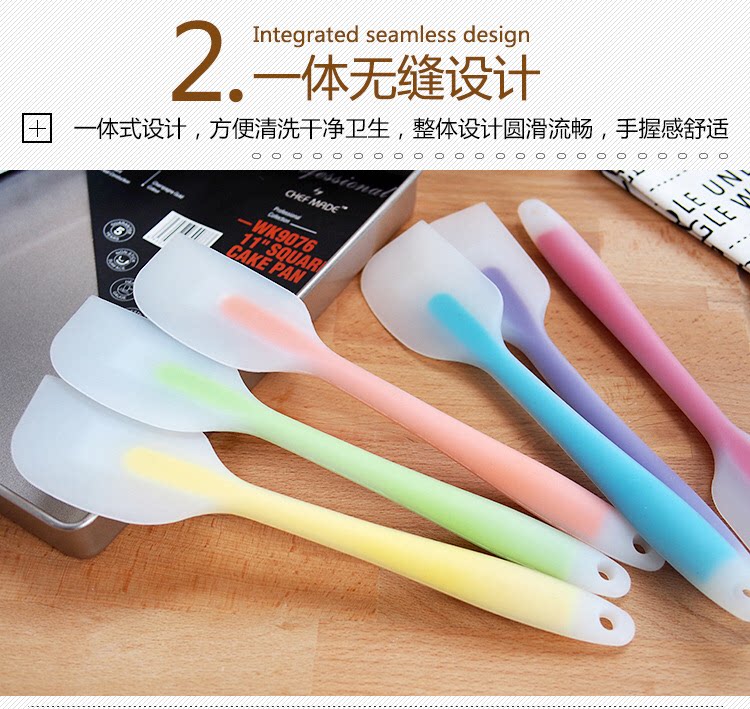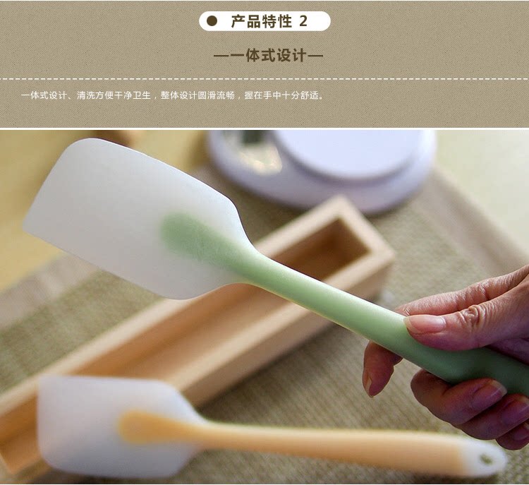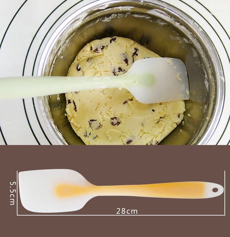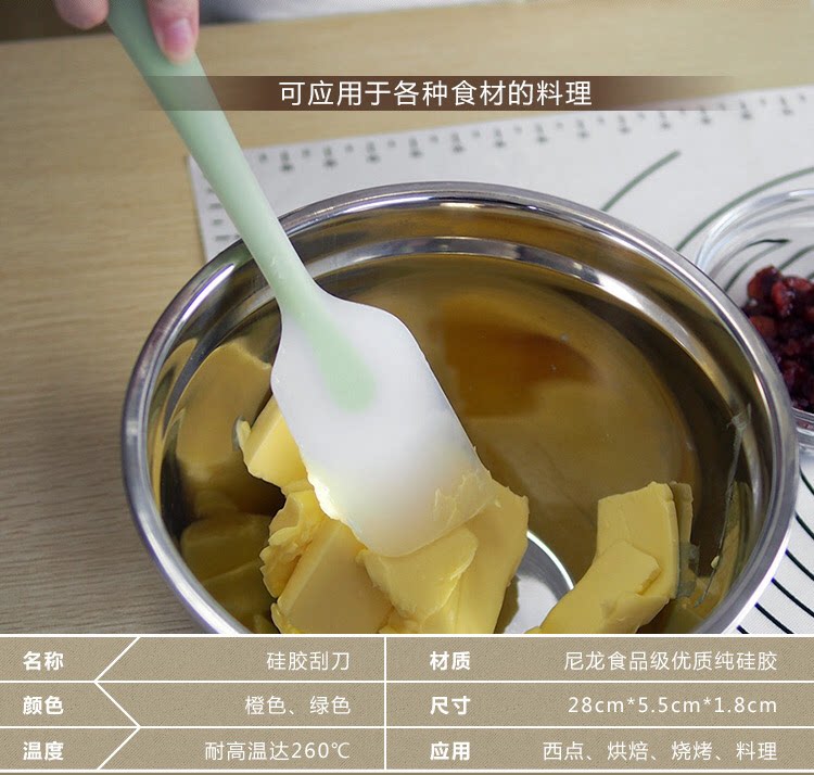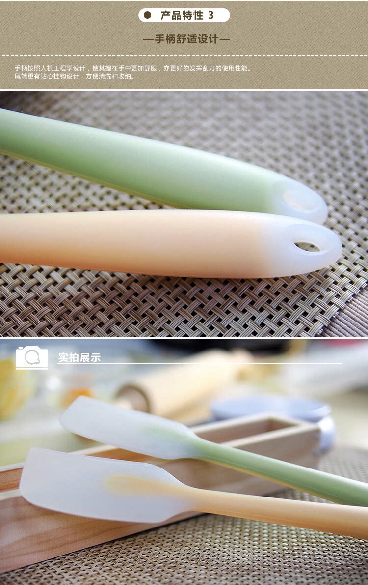 说明:刮刀全身无缝隙无死角,容易清洗,不易滋生细菌,手柄外部是硅胶材质,内部包裹不锈钢柄不易折弯,耐用。硅胶材质为可耐230度高温,可在加热过程中搅拌使用不会老化变硬。