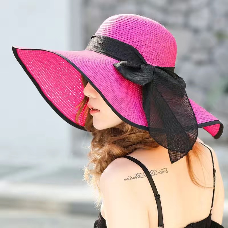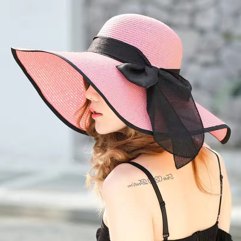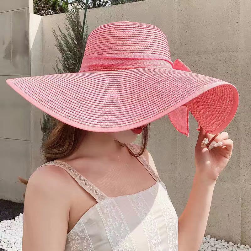 帽子女百搭骑车蝴蝶结草帽女户外防晒遮阳帽网纱时尚太阳帽空顶帽