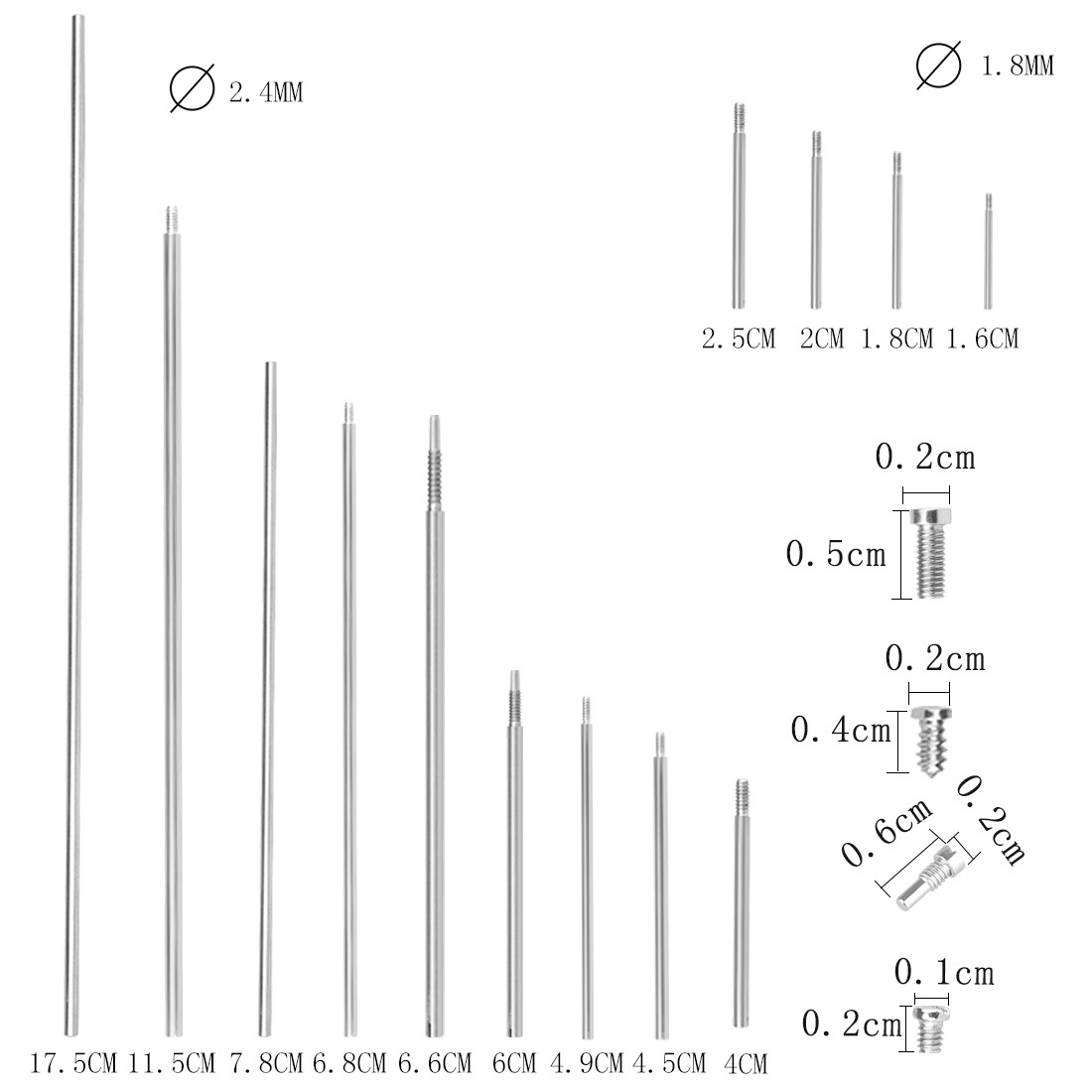 Packing list:Threaded shaft sticks x 21 x 0.6cm small screws x11 0.2cm small screws x10 0.5cm small screws x18 0.4cm small screws x3 |