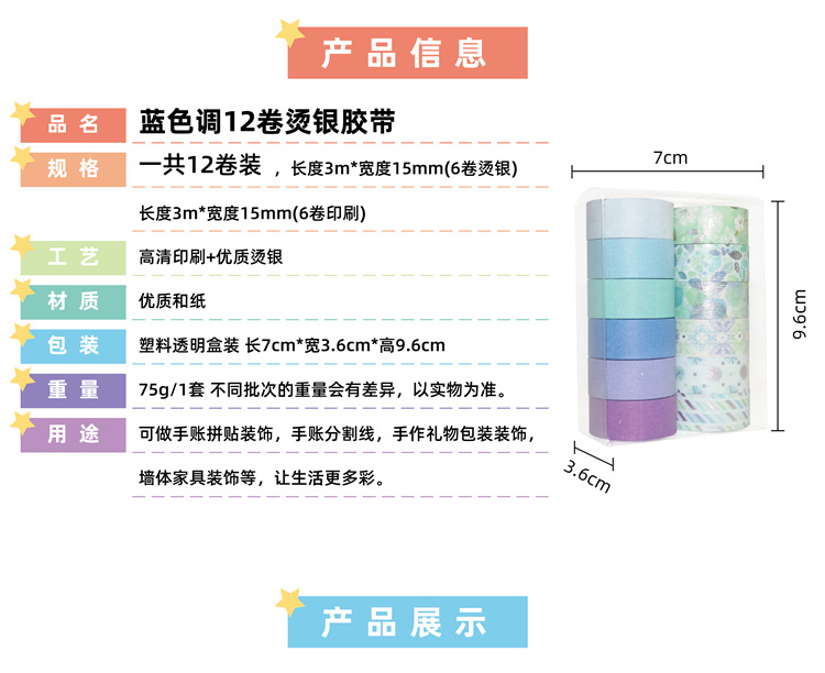 외국 무역 공급 DIY 수첩 장식 은박 테이프 블루톤 12롤 은박 테이프 크로스보더 스티커