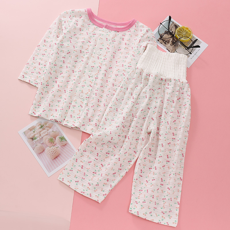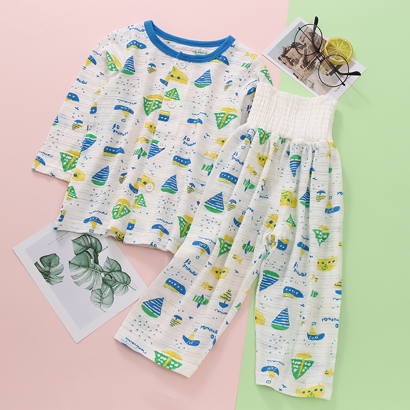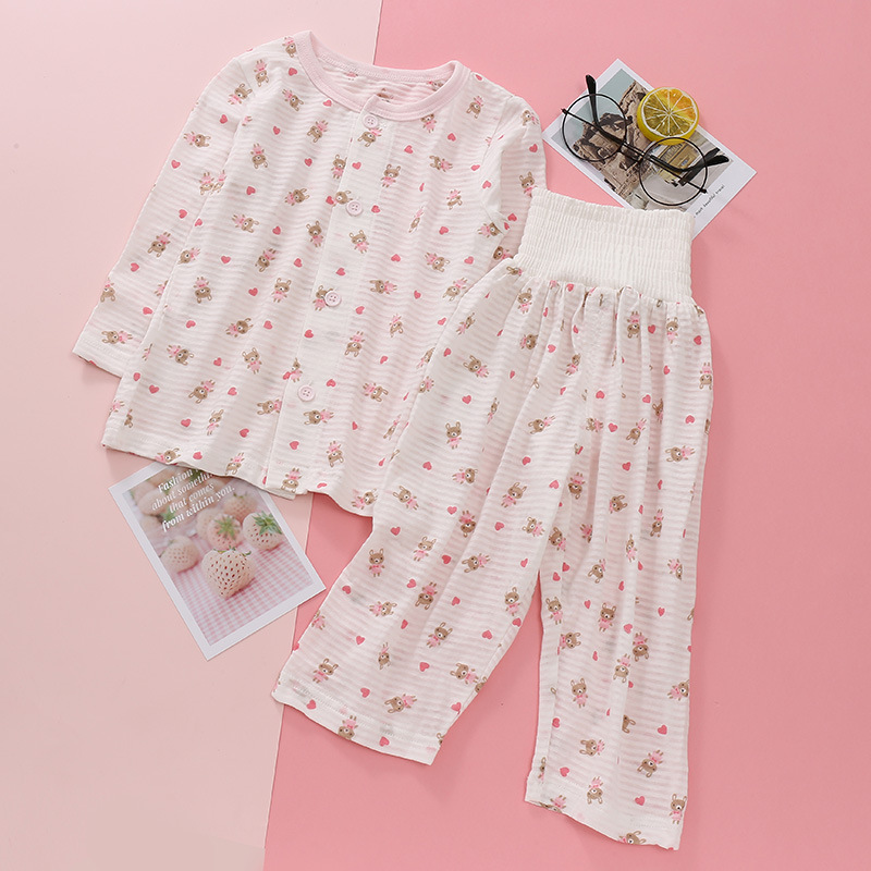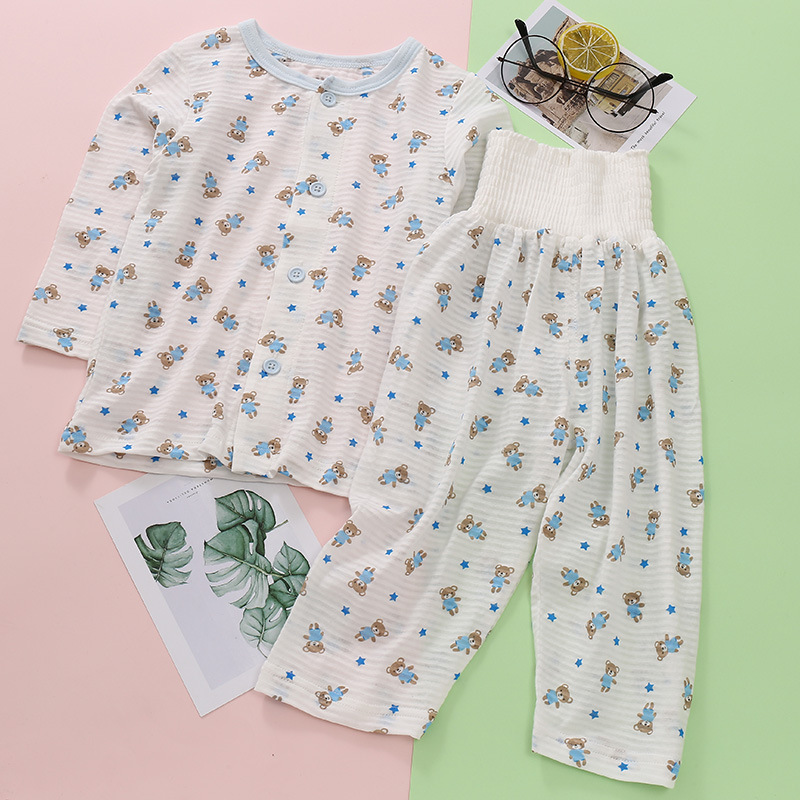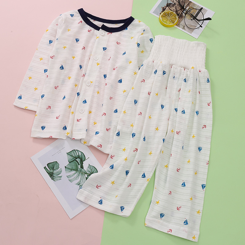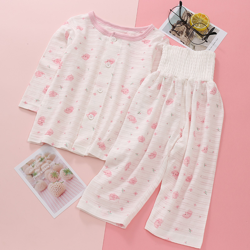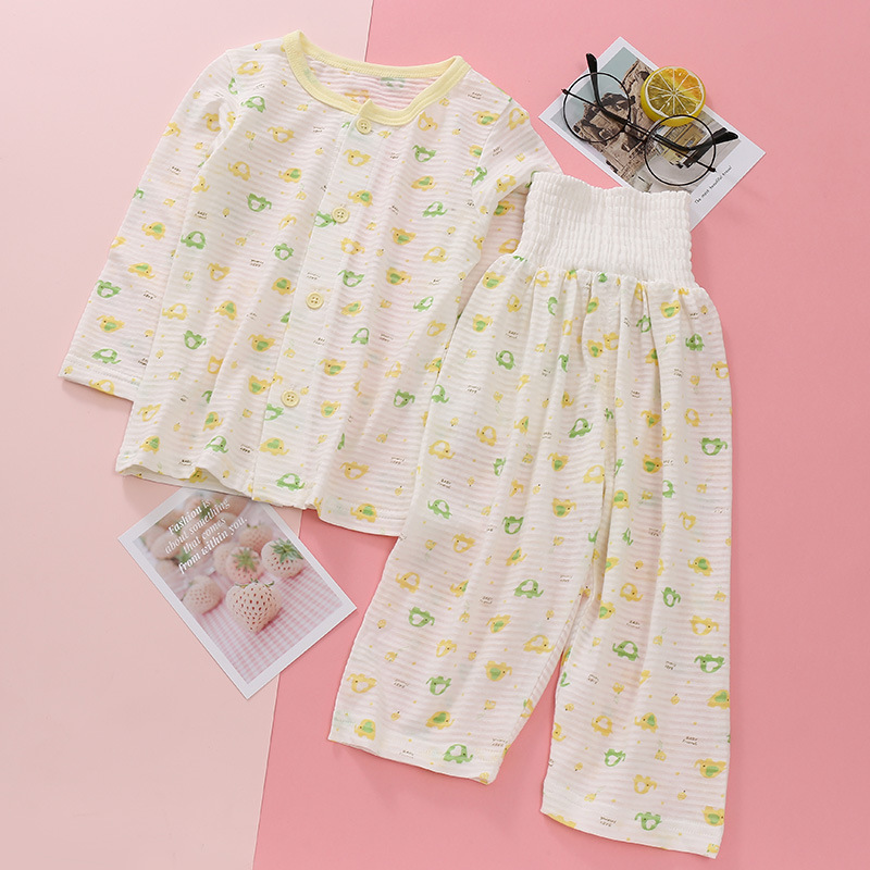 어린이 착용 새로운 여름 얇은 슬러브 면 긴 소매 배 보호 바지 세트 만화 인쇄 2 종 세트