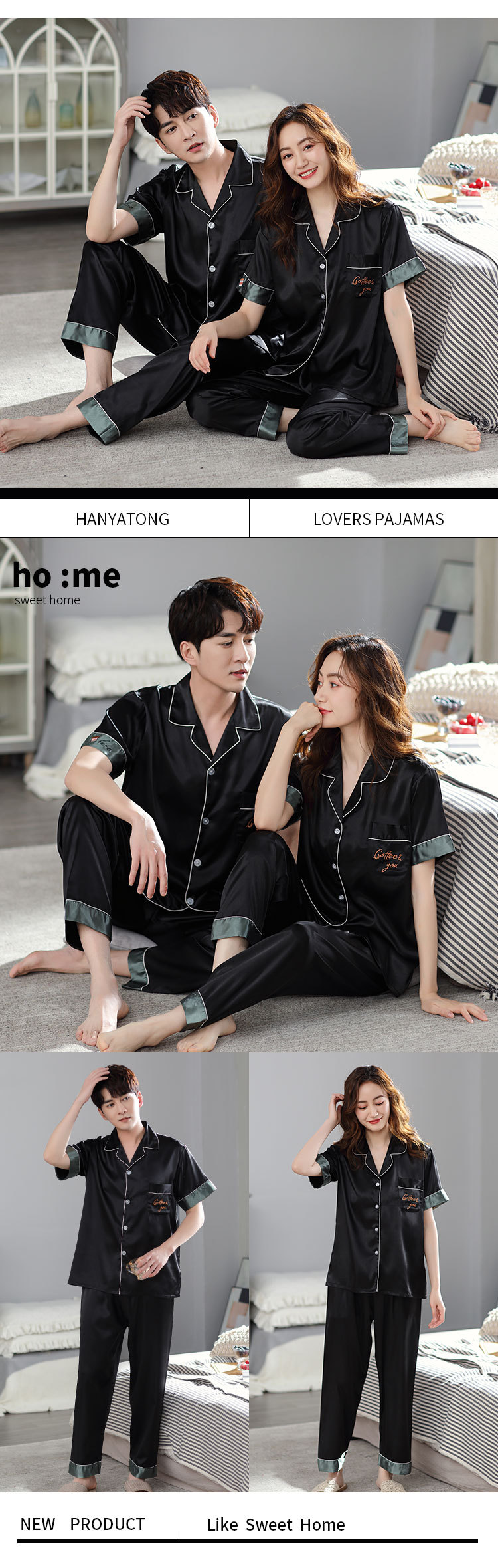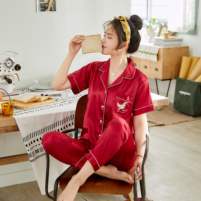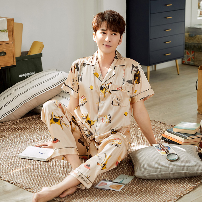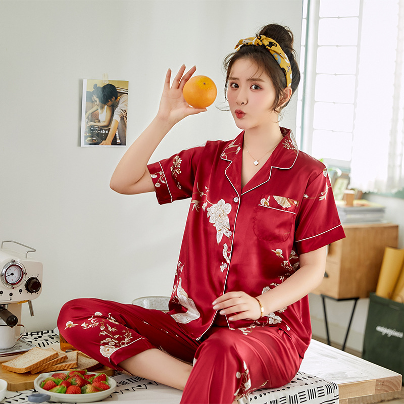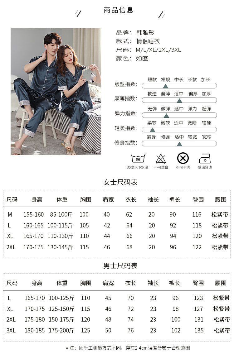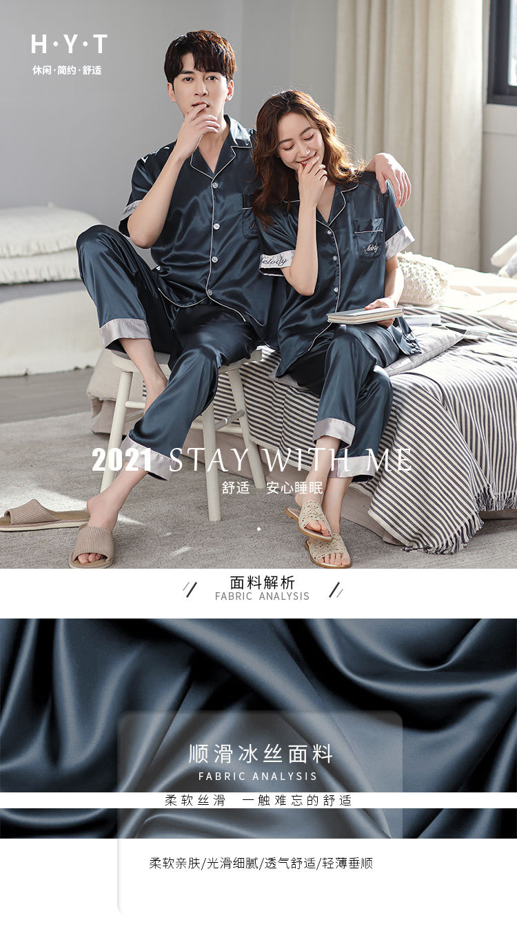 한 Yatong 커플 아이스 실크 잠옷 여름 수 놓은 반팔 바지 실크 가정 의류 남성과 여성을위한 신제품 모조 실크 세트스토어 가기