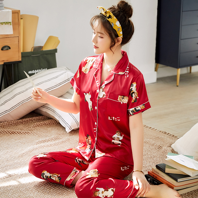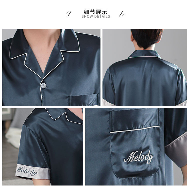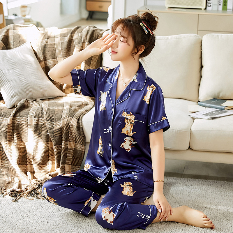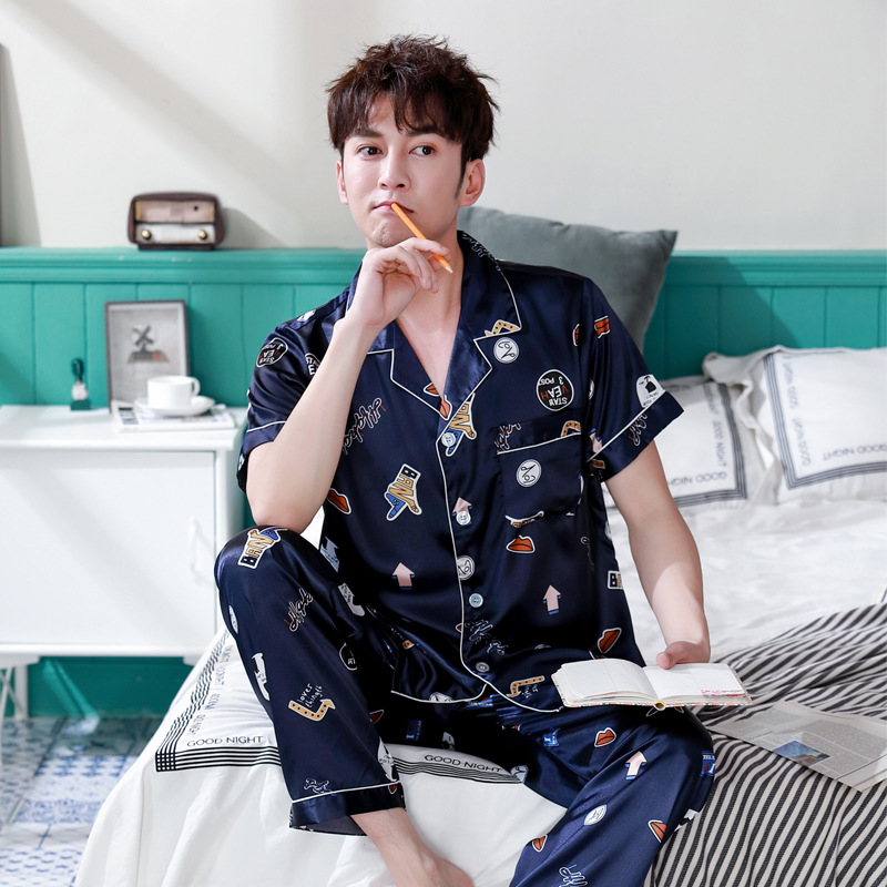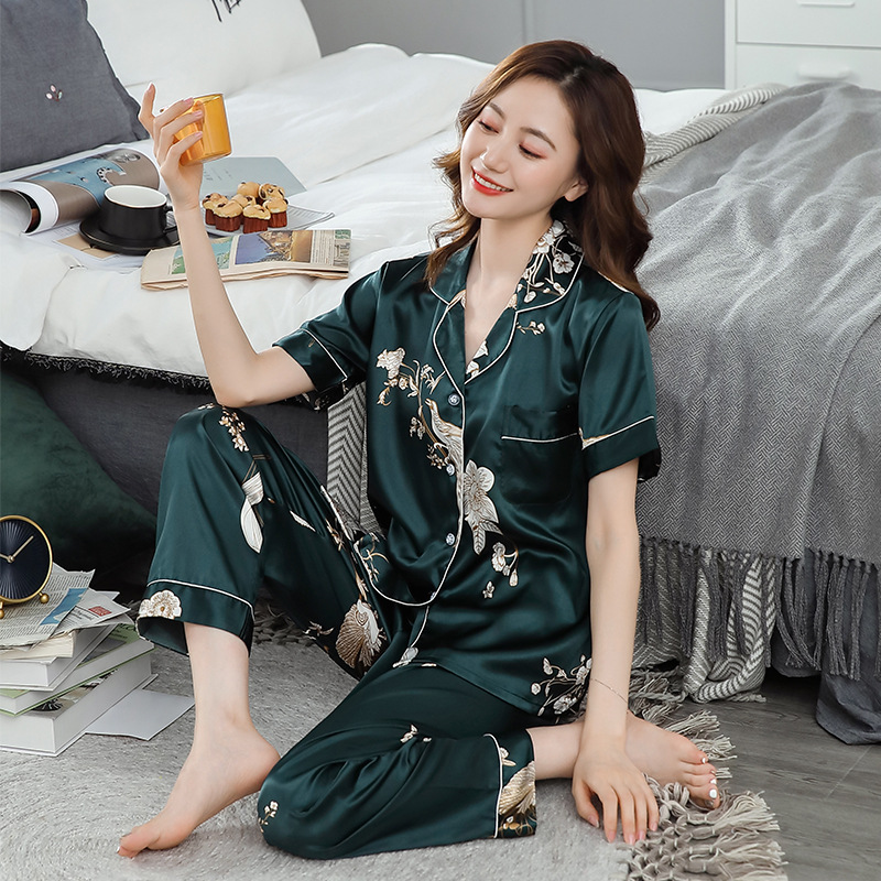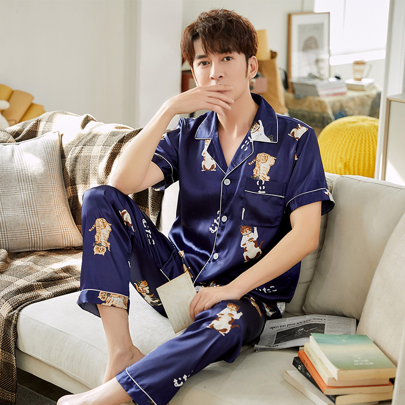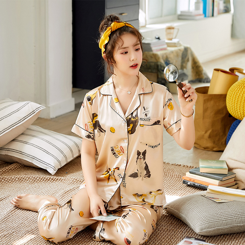 한 Yatong 커플 아이스 실크 잠옷 여름 수 놓은 반팔 바지 실크 가정 의류 남성과 여성을위한 신제품 모조 실크 세트스토어 가기