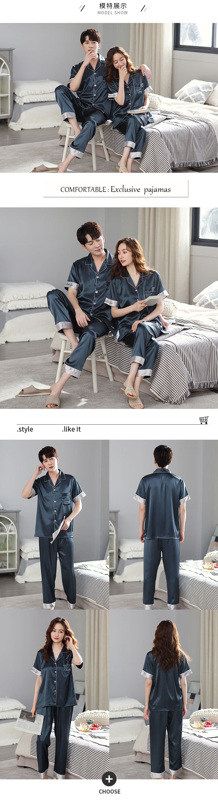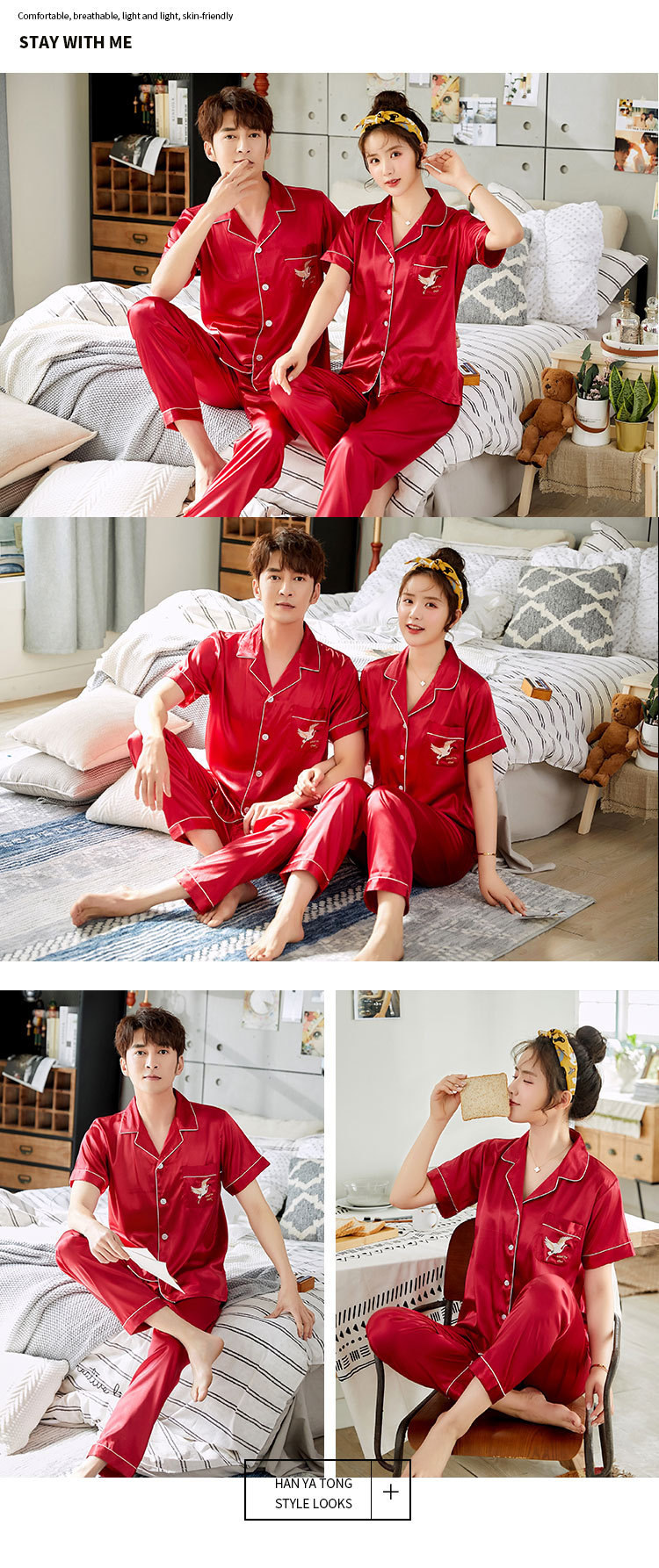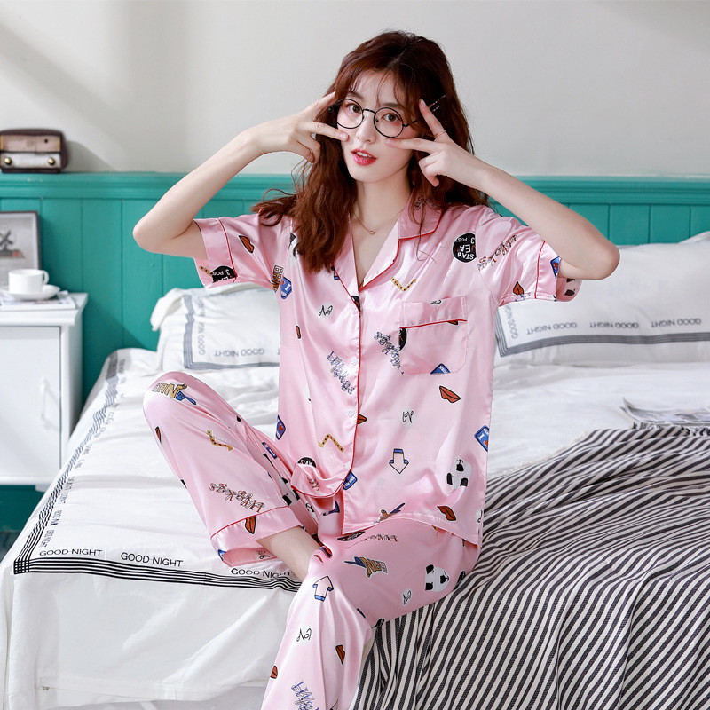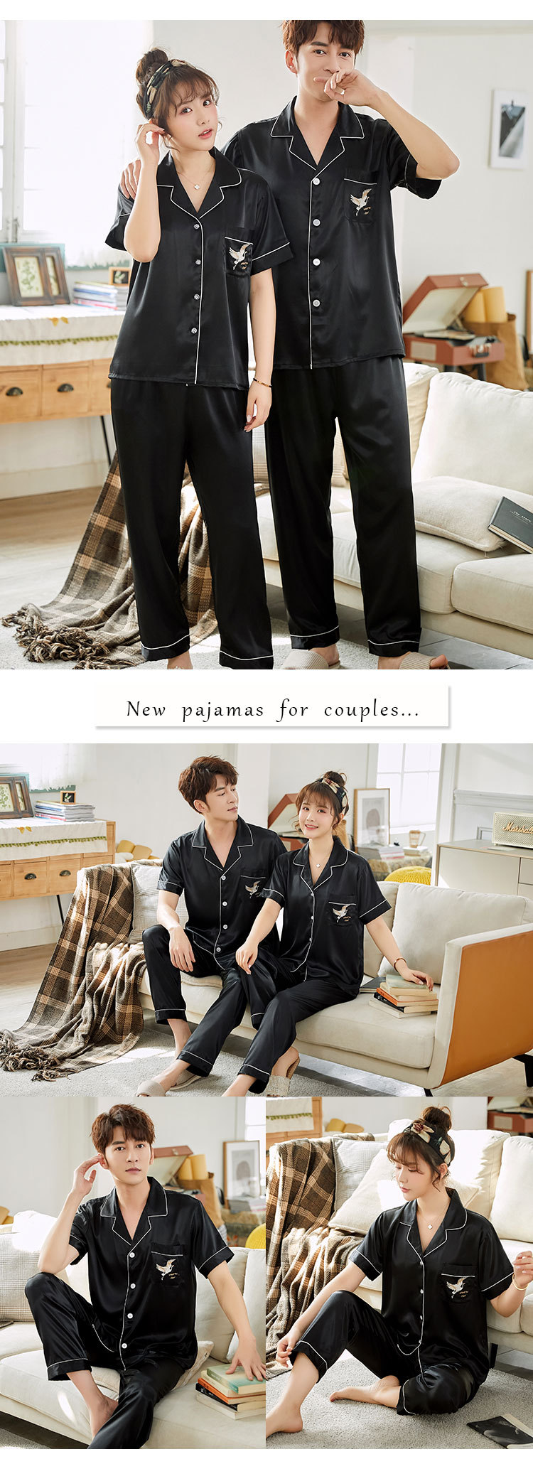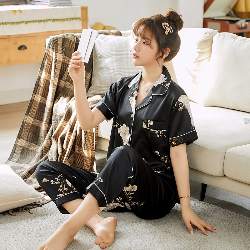 한 Yatong 커플 아이스 실크 잠옷 여름 수 놓은 반팔 바지 실크 가정 의류 남성과 여성을위한 신제품 모조 실크 세트스토어 가기
