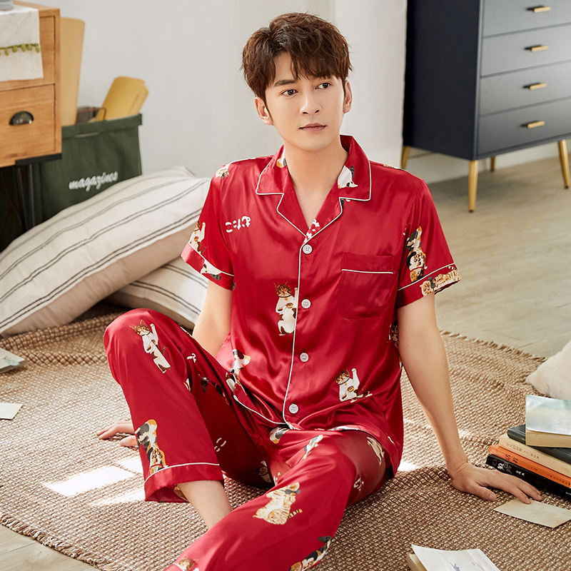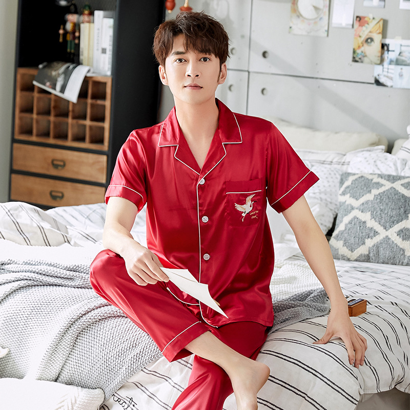 한 Yatong 커플 아이스 실크 잠옷 여름 수 놓은 반팔 바지 실크 가정 의류 남성과 여성을위한 신제품 모조 실크 세트